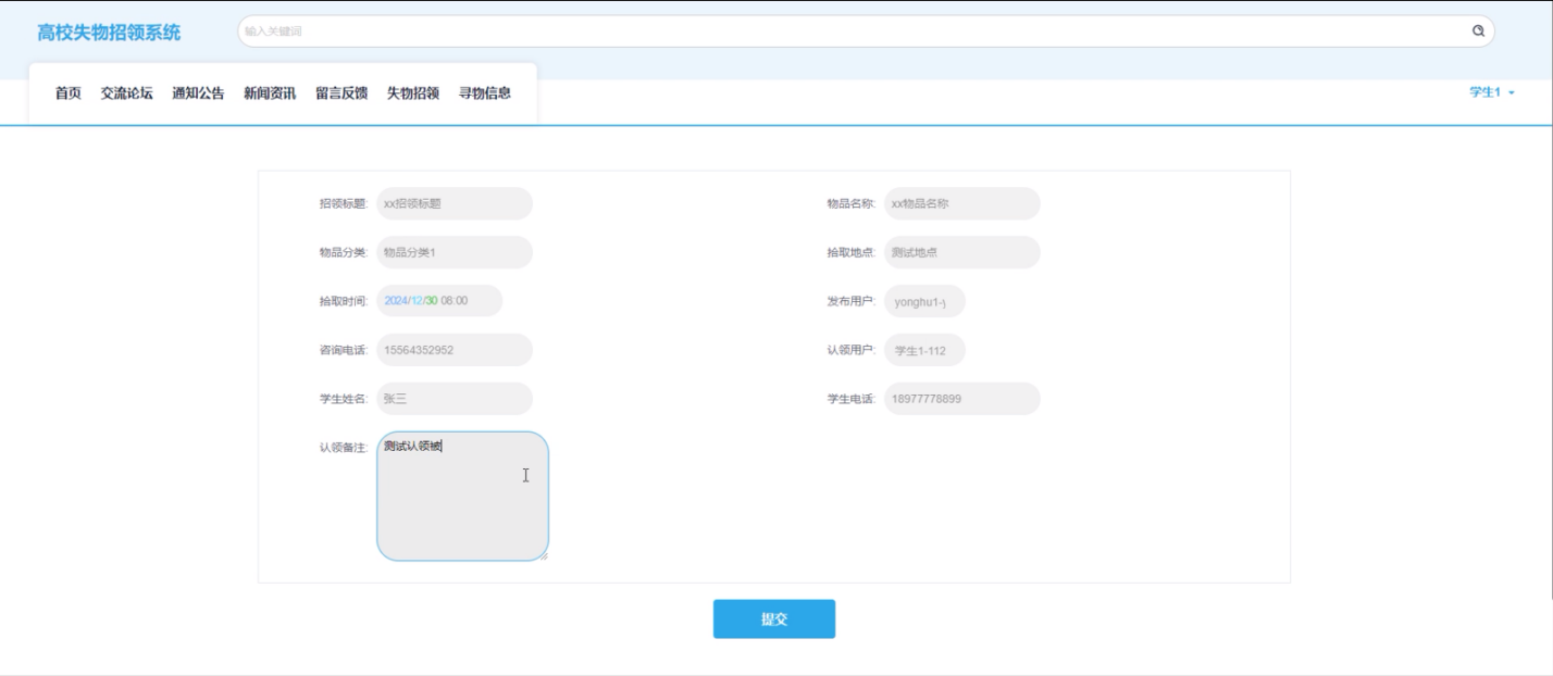 失物招领:失物招领模块允许学生用户查看失物招领信息。用户可以输入物品名称或选择物品分类进行搜索,查看详细的失物信息,包括招领标题、物品名称、拾取地点、封面图片、拾取时间、咨询电话等。学生用户还可以对失物信息进行点赞、收藏、评论和认领。