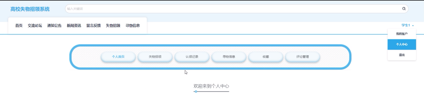 个人中心是用户管理个人信息和活动记录的界面。用户可以查看个人首页、管理失物招领信息(发布和管理自己的失物招领信息)、查看认领记录、管理寻物信息(发布和管理自己的寻物信息)、管理收藏和评论。个人中心为用户提供了一个集中的地方来控制自己的活动和信息。 界面如下图所示。
