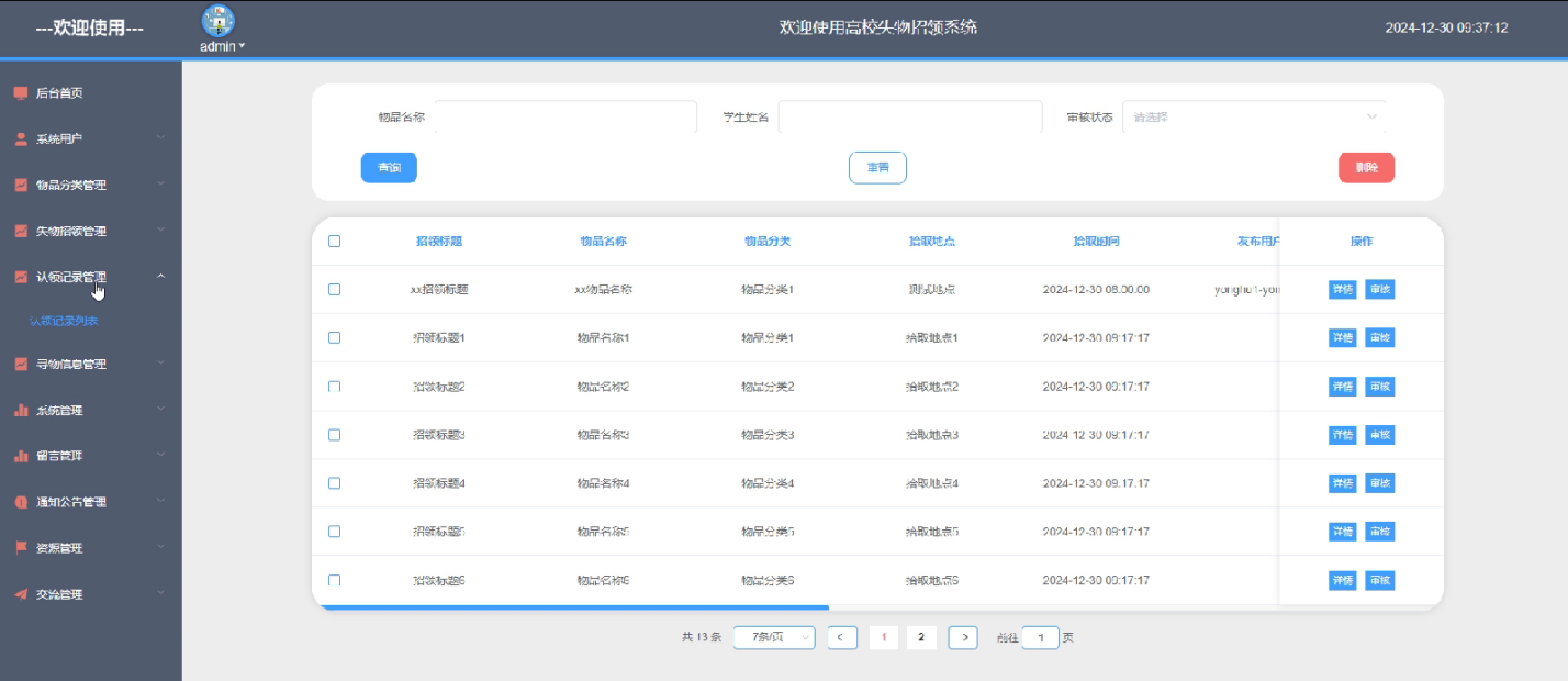 认领记录管理:管理员可以管理失物招领的认领记录,通过学生姓名、审核状态进行查询、删除操作,并可对学生提交的认领信息进行审核,确保认领流程的正确性和安全性。