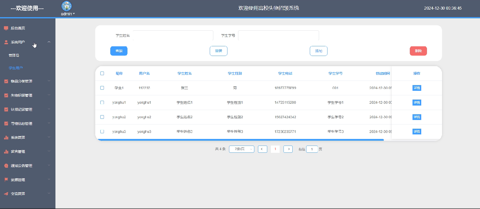 Through testing and trial operation of the system, it has been proven that the lost and found system can effectively solve the problem of lost items on campus, improve the possibility of owners finding lost items, and also reduce the workload of school management departments. In summary, this system not only meets the internal needs of universities for lost and found items, but also provides reference cases for other similar application scenarios.