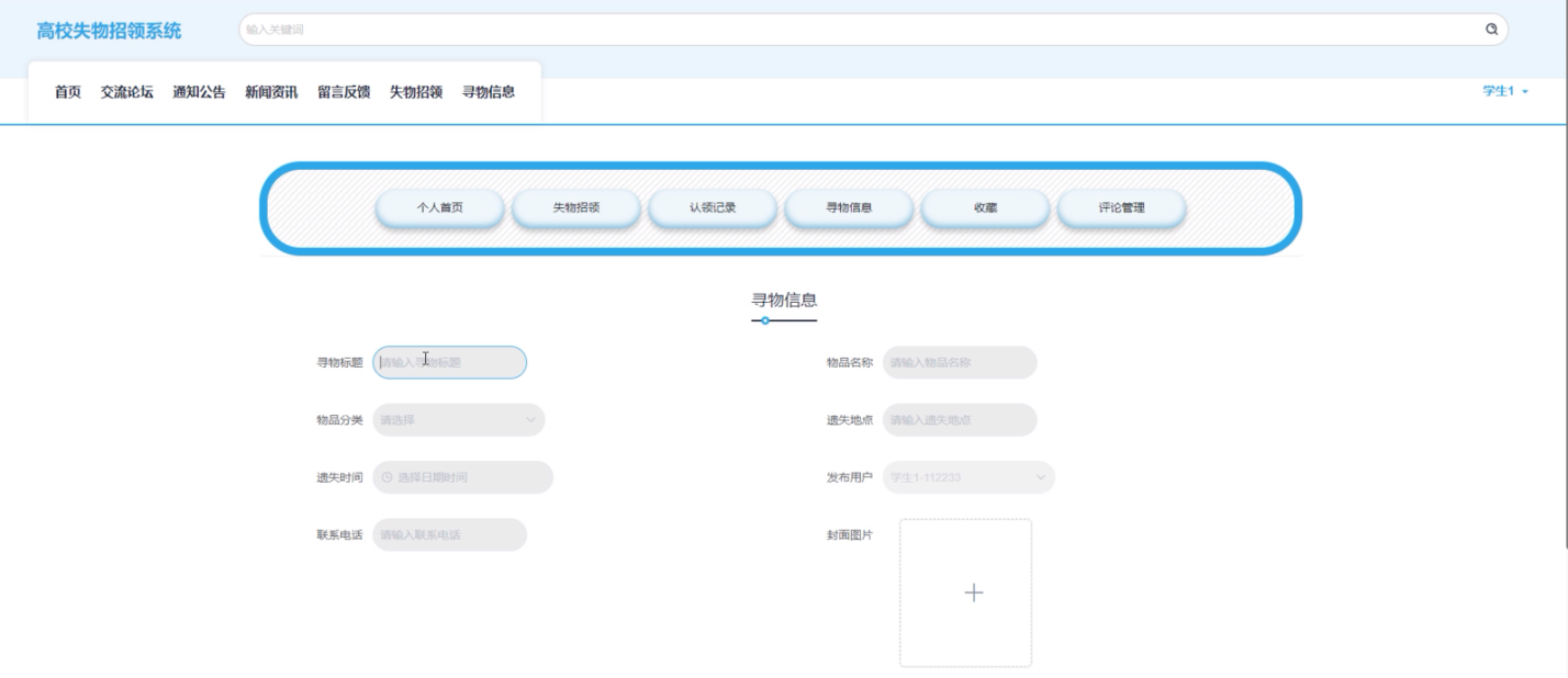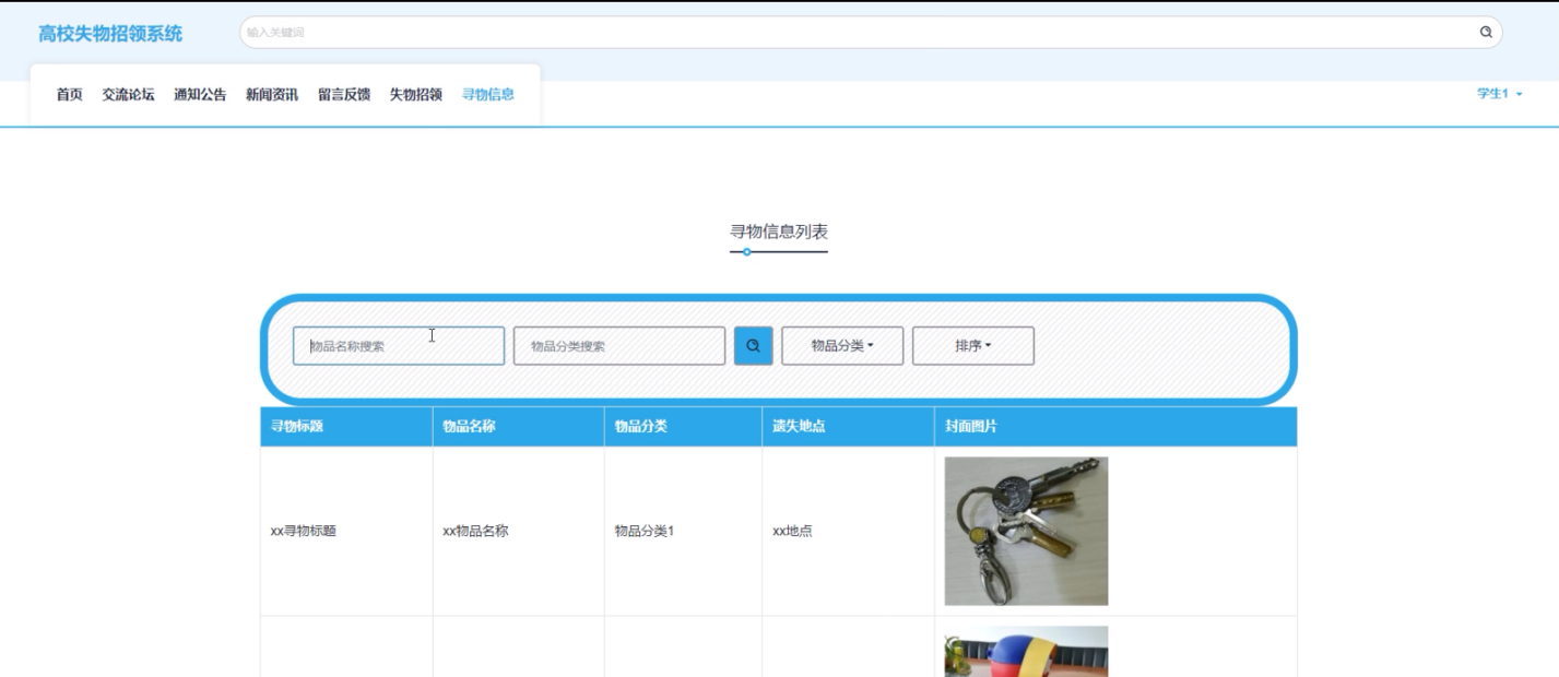 寻物信息:寻物信息模块允许学生用户查看寻找丢失物品的信息。学生用户可以输入物品名称或选择物品分类进行搜索,查看详细的寻物信息,包括寻物标题、物品名称、遗失地点、封面图片、遗失时间、联系电话等。用户还可以对寻物信息进行点赞、收藏和评论。