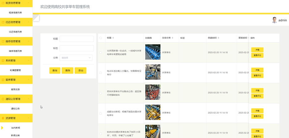 操作人员可以对共享单车进行新增、编辑、删除、状态更新等操作,确保单车信息的准确性和实时性,其共享单车管理主界面展示如下图所示。