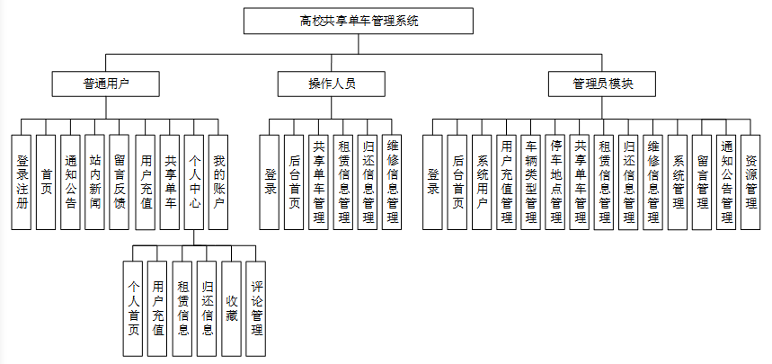 (3)在基于PHP的高校共享单车管理系统设计与实现中,首先要确定系统的技术,然后进行在线确认,以确定系统的用户角色,并根据这些角色划分出相应的功能模块。系统的设计主要将用户分为管理员、普通用户角色,每个功能模块都有其特定的功能,但是系统的数据库都是交互式的,普通用户可以随时根据自身的需求查看和管理知公告、站内新闻、留言反馈、用户充值、共享单车等,而管理员可以快速收集用户的详细信息,并能够在第一时间响应客户的需求。