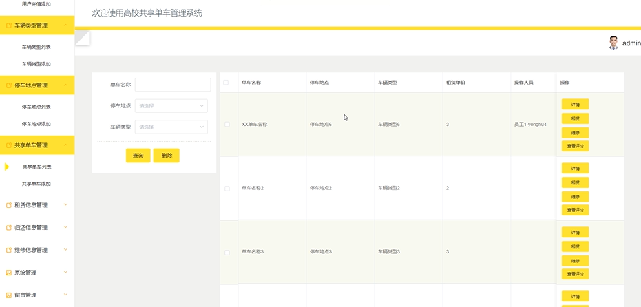 操作人员可以查看和管理用户的租赁信息记录,包括租赁时间、地点、单车编号、用户信息等,方便后续跟踪和处理。租赁信息管理界面如下图所示。