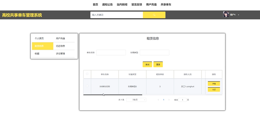 租赁信息详细记录用户的租赁历史,包括租赁时间、地点、单车编号等信息,方便用户查询。租赁信息界面如下图所示。