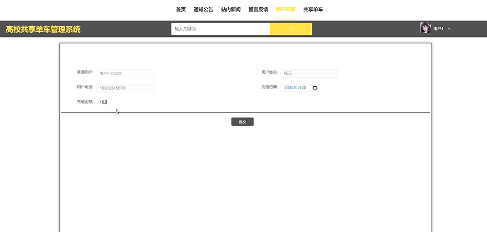 用户充值:用户可以在线进行账户充值,用于支付共享单车租赁费用。