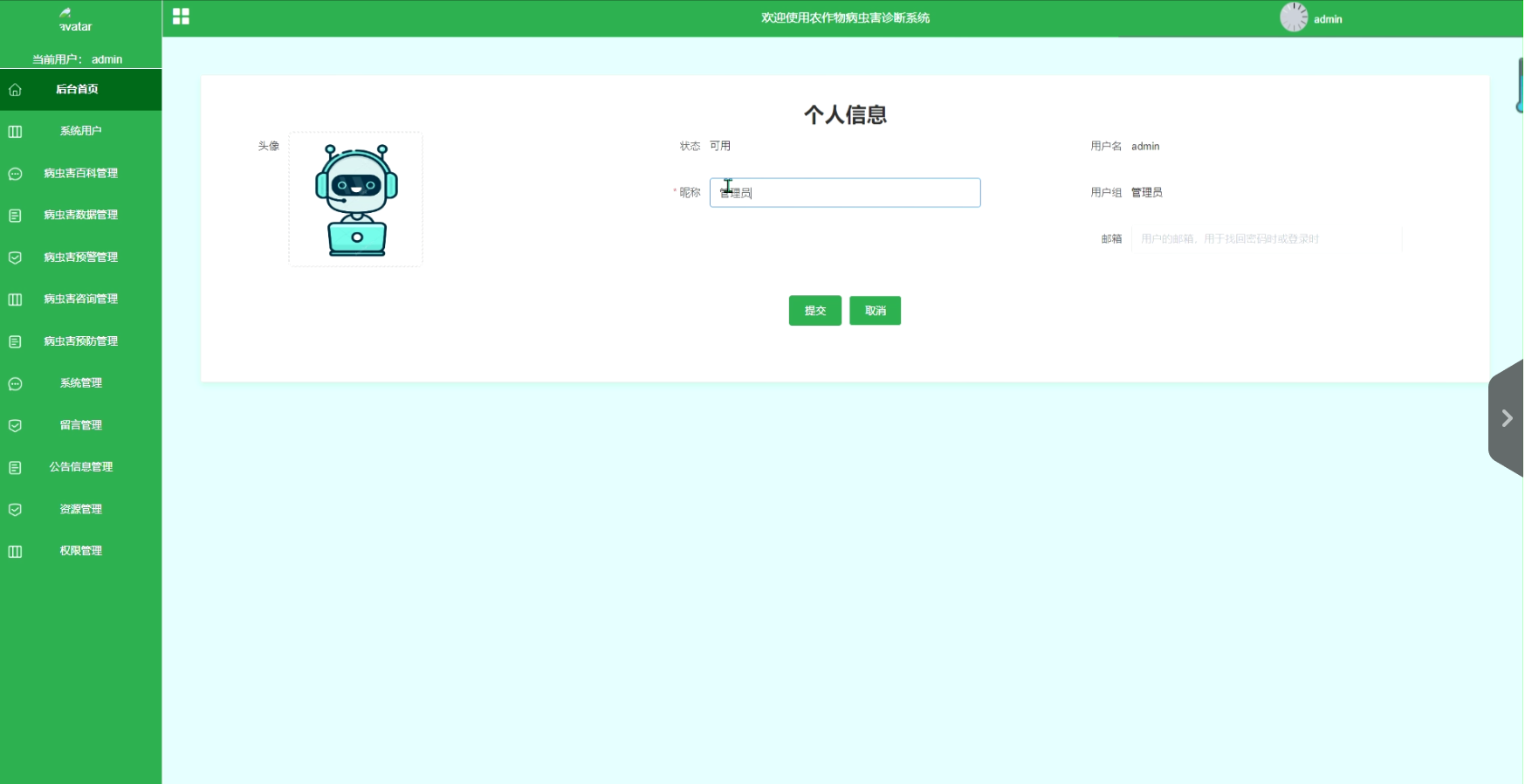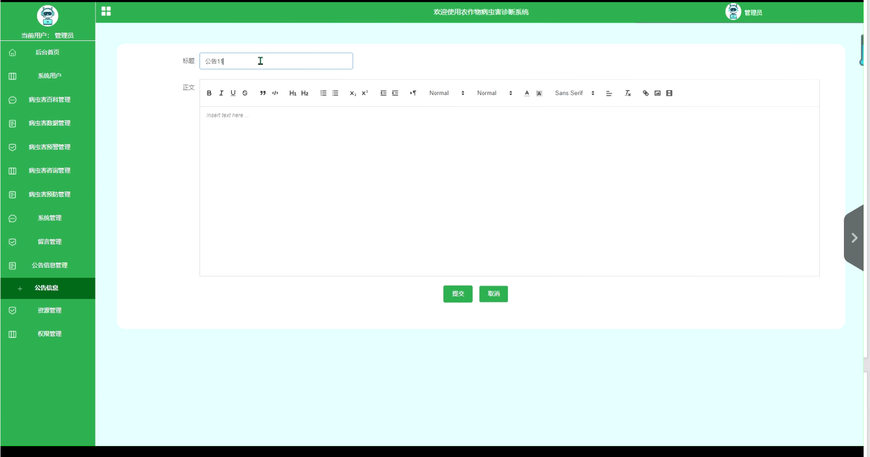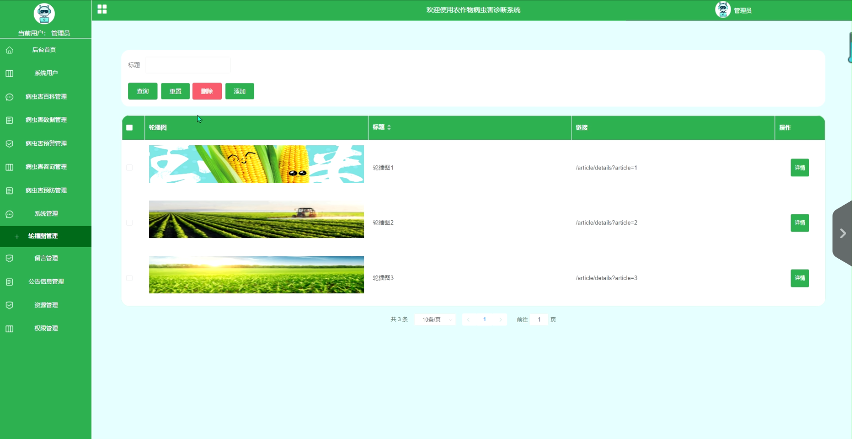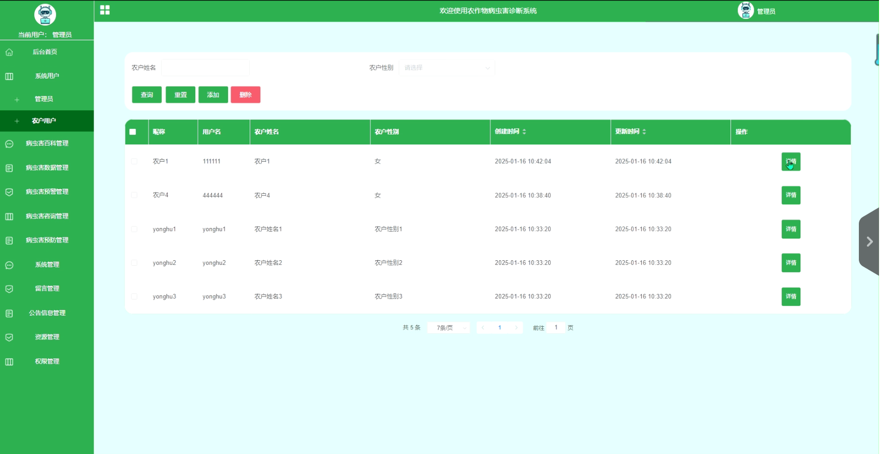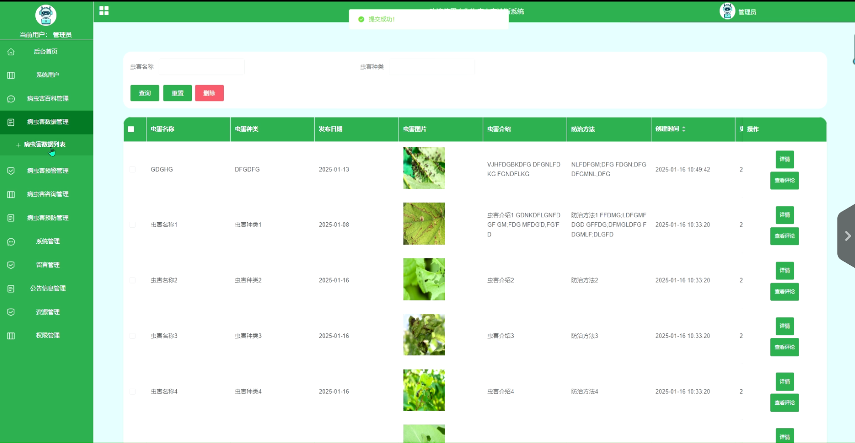 病虫害数据管理:管理员可以查看和管理病虫害数据列表,也可以添加新的病虫害数据。