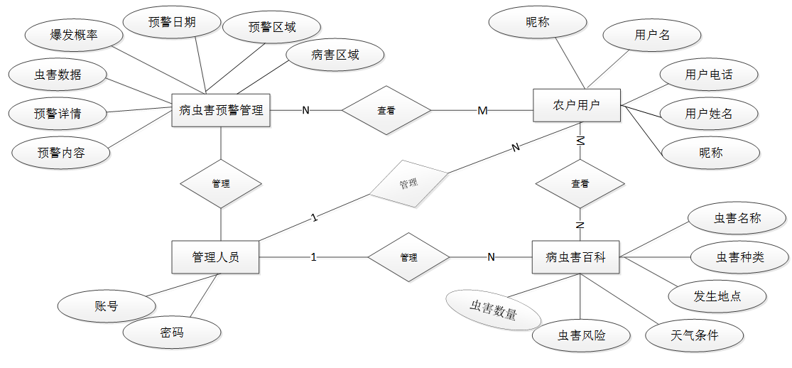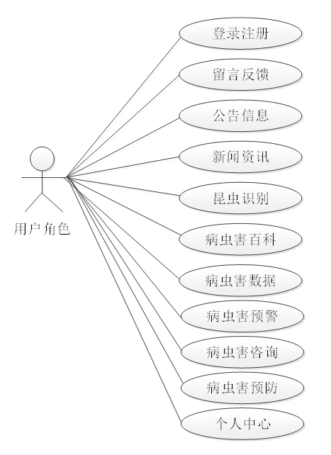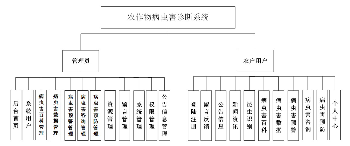 根据对系统的功能的分析,可以总结基于django的农作物病虫害诊断系统的具体功能模块包括下面的几个主要的功能模块:该系统主要从两大模块进行设计的,首先就是用户参与操作需要的模块,此外还需要有管理员用到的模块,两者之间不是互相独立的,他们之间有着密切的联系,同数据库表中的数据连接起来进行操作。每个模块访问相同的数据库,但访问的表不同。系统的各个功能模块是根据所收集的资料研究得到的。在以上分析功能的基础上,系统模块分为多个模块。农户用户含有的功能有公告信息、新闻资讯、留言反馈、昆虫识别、病虫害百科、病虫害数据、病虫害预警、病虫害预防等。,管理员含有的功能有后台首页、系统用户、病虫害百科管理、病虫害数据管理、病虫害预警管理、病虫害咨询管理、病虫害预防管理、系统管理(轮播图管理)、公告信息管理、资源管理(新闻资讯、资讯分类)、留言管理、权限管理等功能。