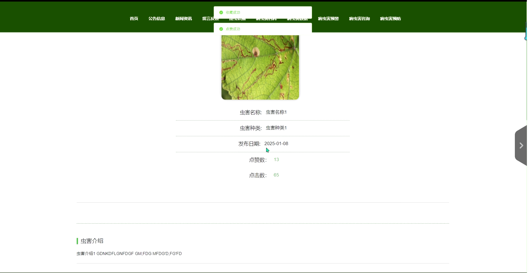 病虫害数据:展示病虫害数据列表,用户可以根据自己的兴趣收藏、点赞、评论。