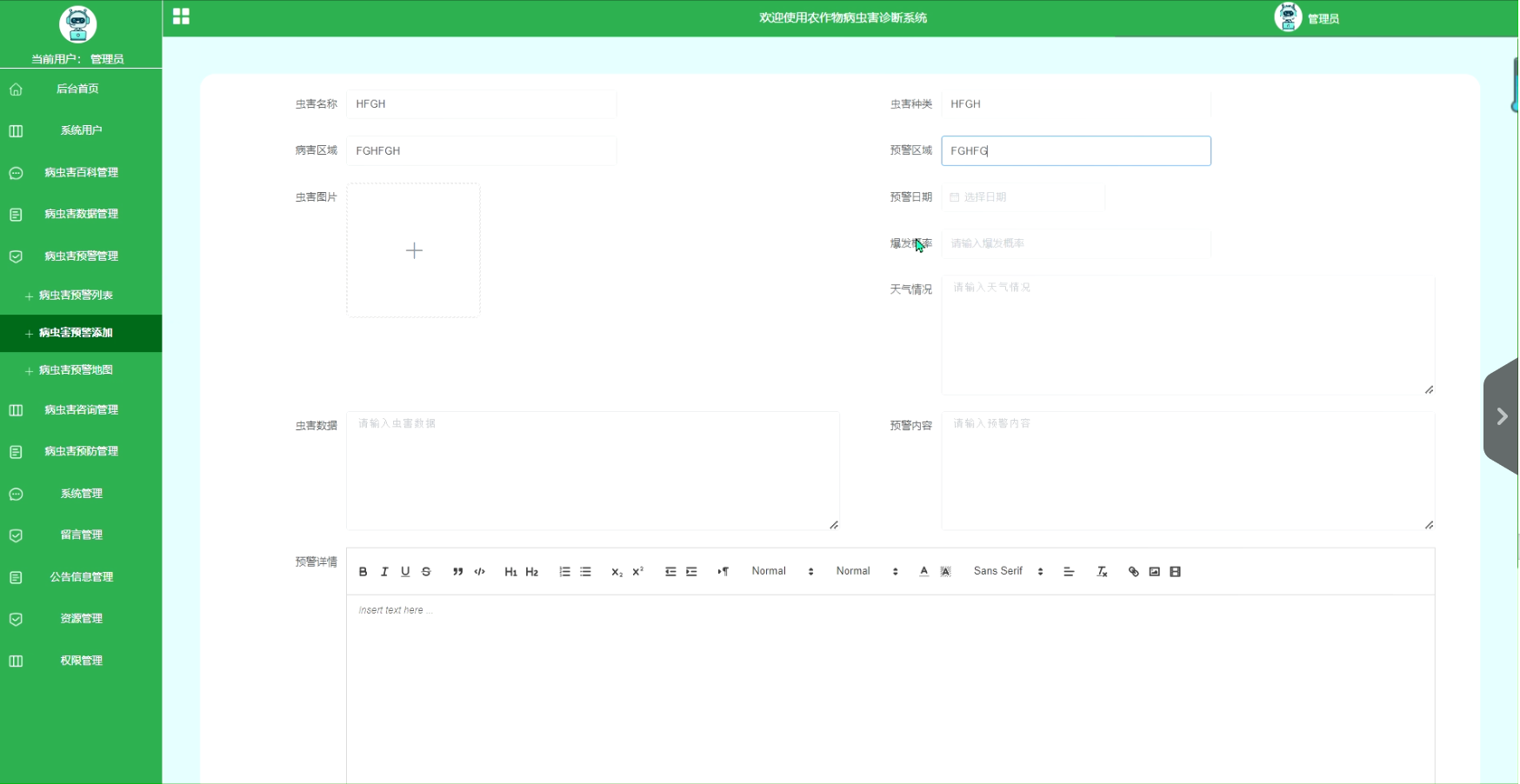病虫害预警管理:管理员可以查看和管理病虫害预警列表,也可以添加新的病虫害预警信息。