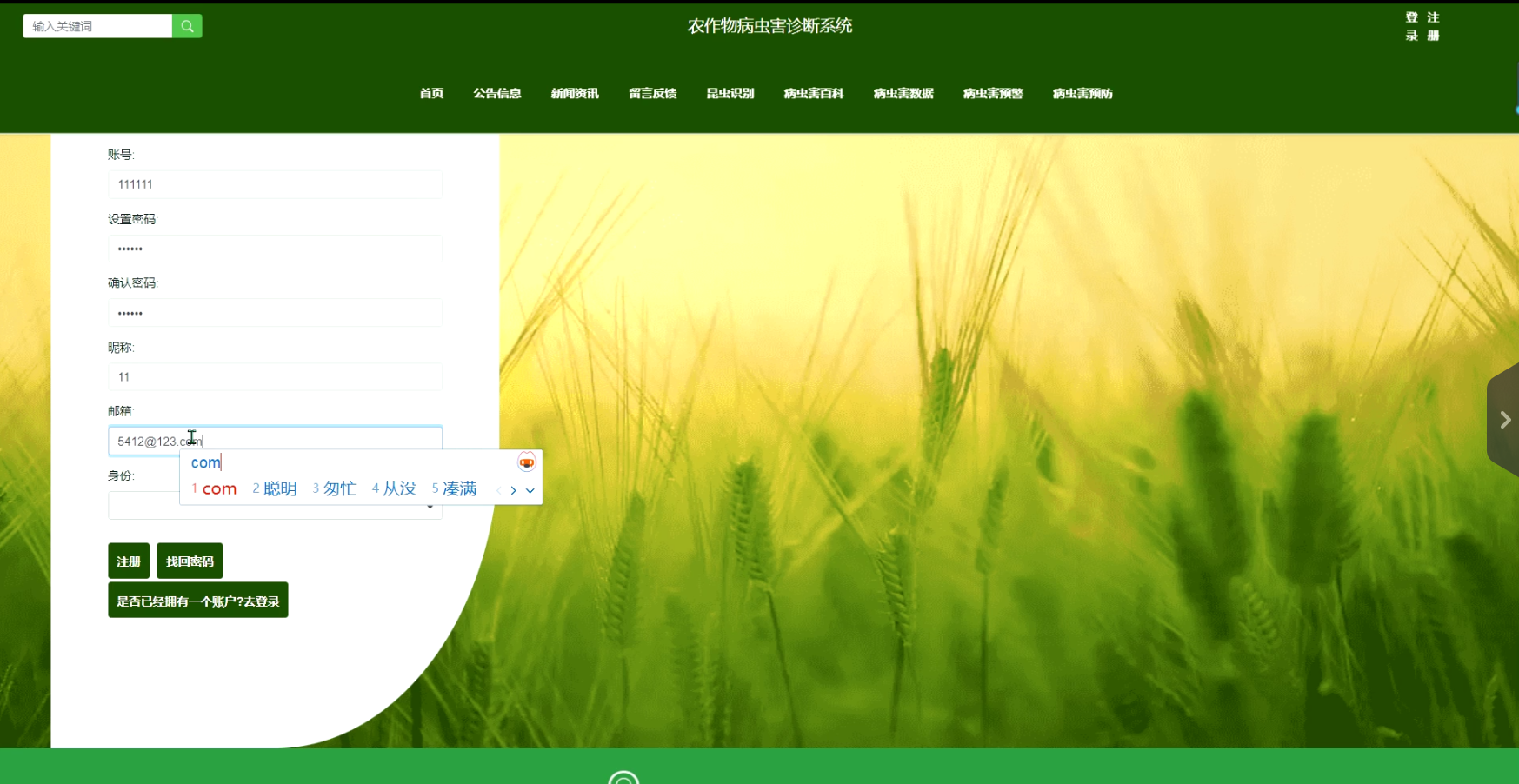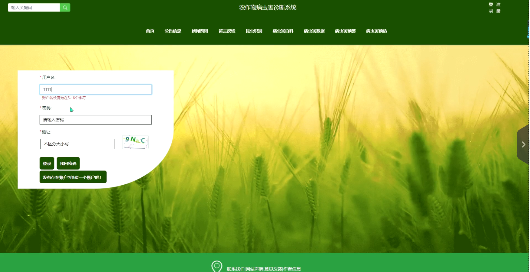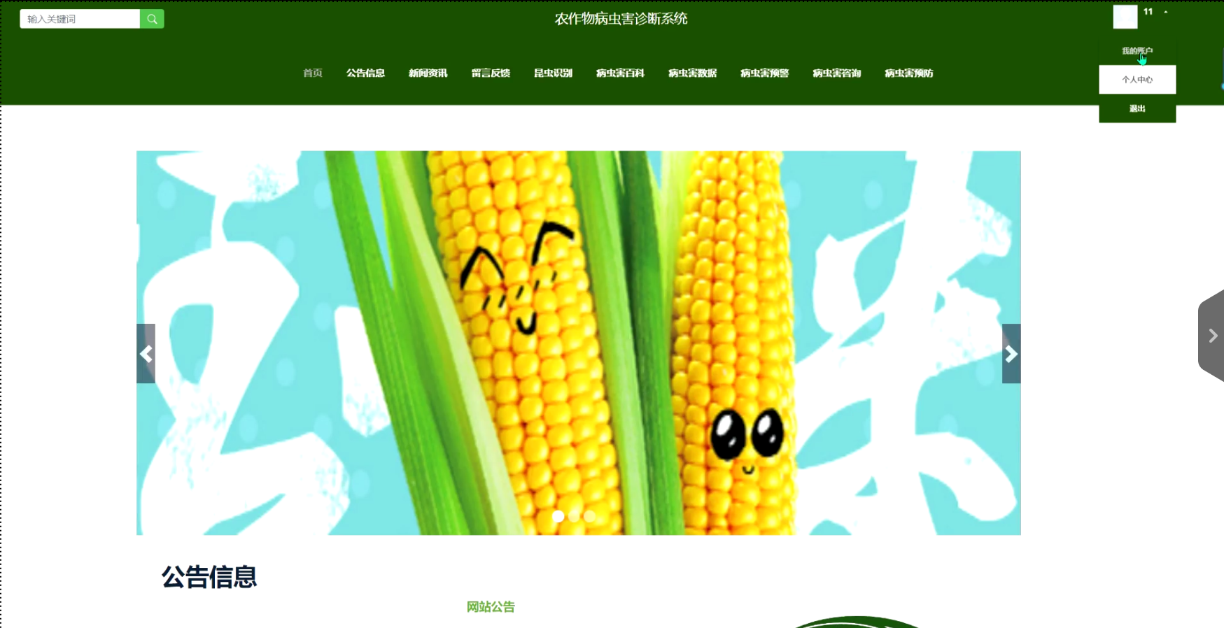 首页:展示系统的核心信息,包括公告信息、新闻资讯、留言反馈、昆虫识别、病虫害百科、病虫害数据、病虫害预警、病虫害预防等。用户可以在首页浏览和搜索病虫害百科等信息。
