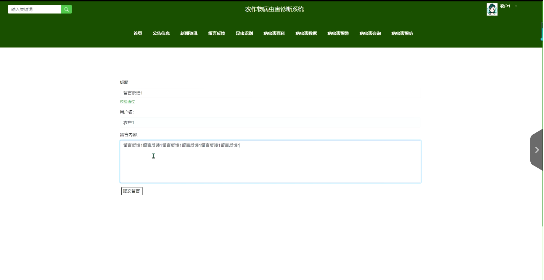 留言反馈:提供用户参与留言反馈的功能,以收集用户对病虫害诊断的意见和建议,为后续的诊断工作提供数据支持,界面如下图所示。