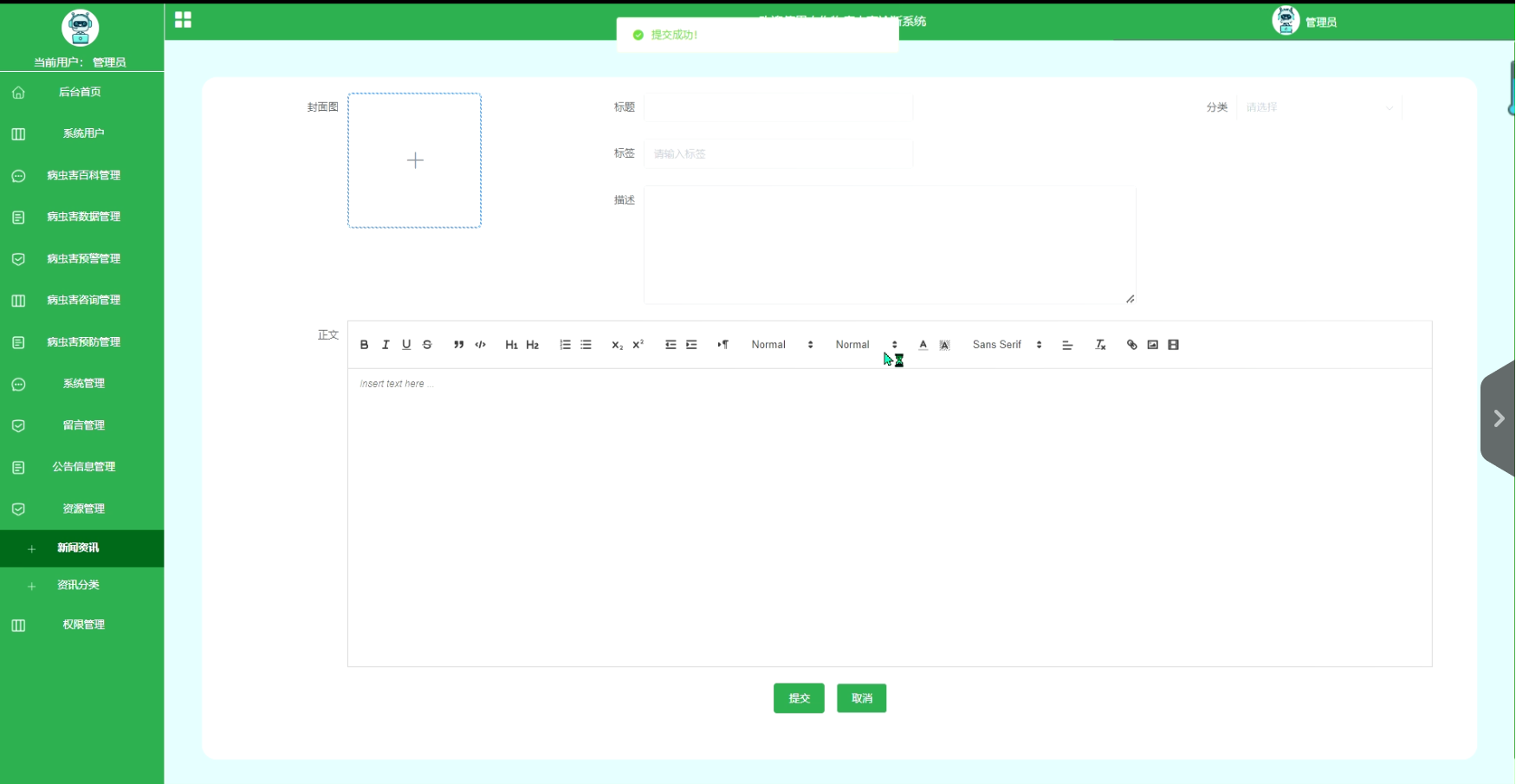 | 点击添加病虫害百科,必填项合法输入,点击保存 | 提示添加成功 | 与预期结果一致 |
