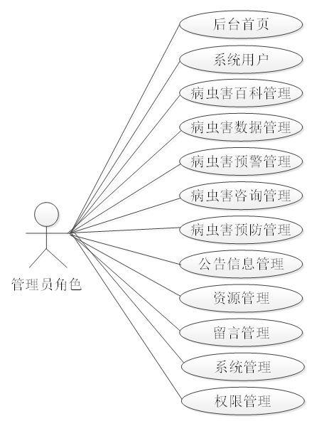 系统的用例展示的是系统功能与用户之间的关系,通过用例的方式能够直观的展示出来,本基于django的农作物病虫害诊断系统的完整UML用例图如下所示。