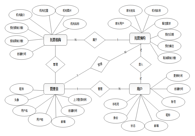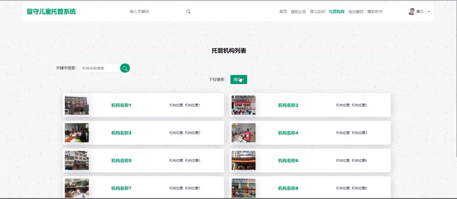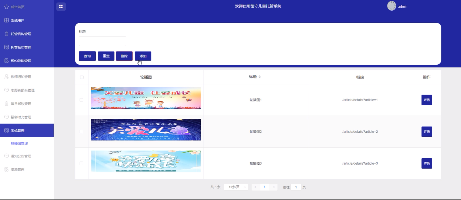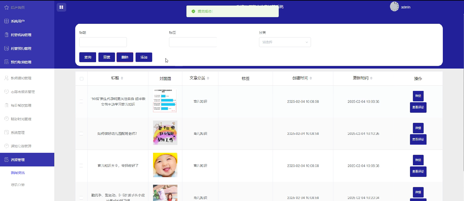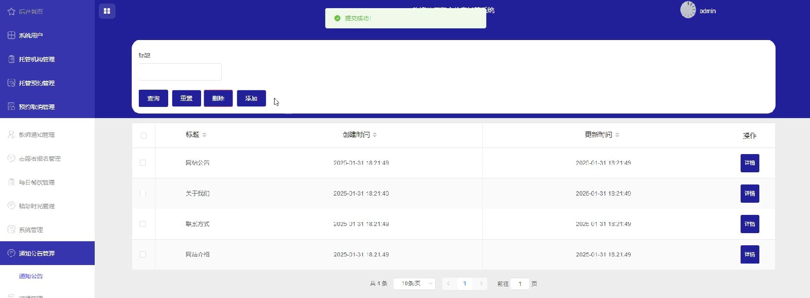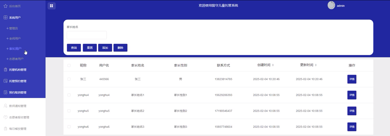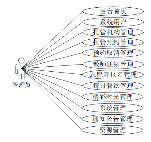 后台管理端:管理员可登录系统后台进行管理,拥有用户管理、托管机构管理、托管预约管理、预约取消管理、教师通知管理、志愿者报名管理、每日餐饮管理、精彩时光管理、系统管理、通知公告管理、资源管理等功能。