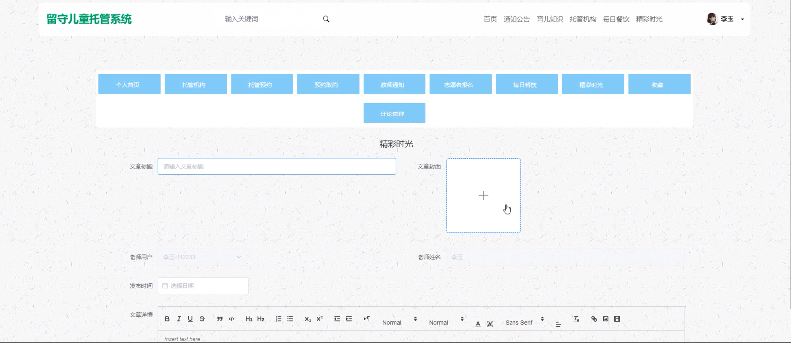 精彩时光:精彩时光模块展示学生在校园或托管机构中的精彩瞬间和活动照片,老师可以查看这些文章的标题、封面、发布时间和详情。老师还可以对这些内容进行点赞、收藏或评论,记录和分享学生的成长点滴。