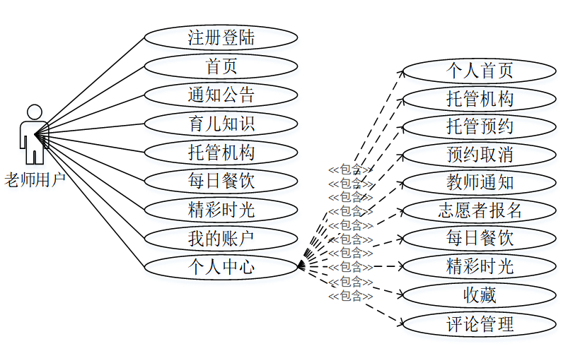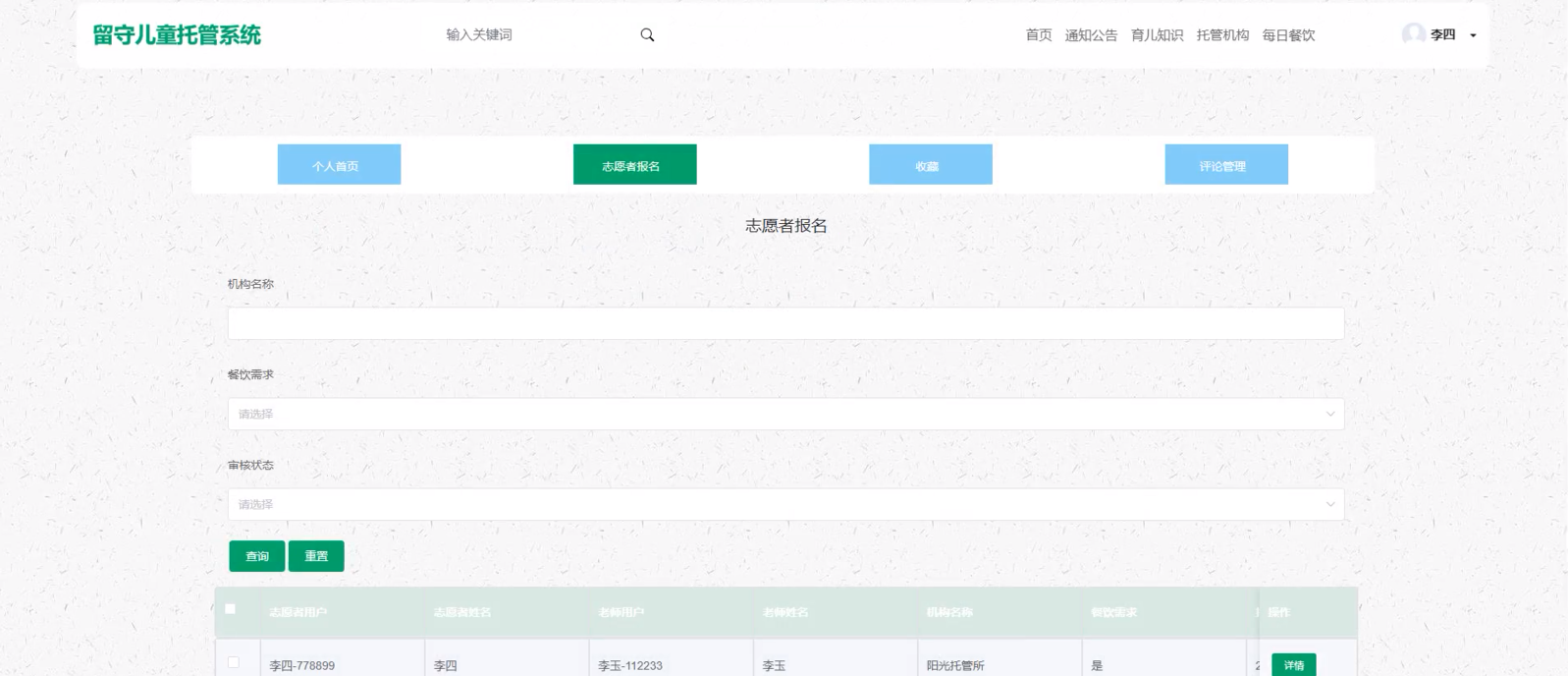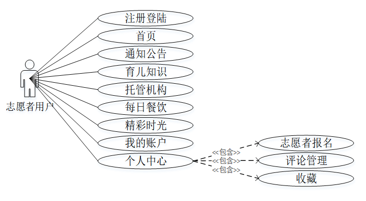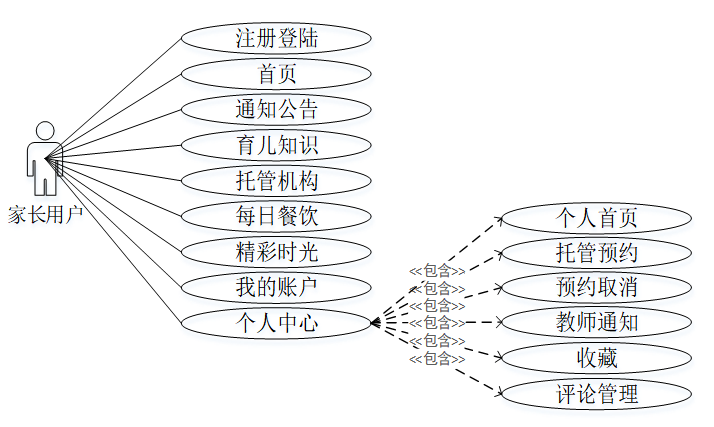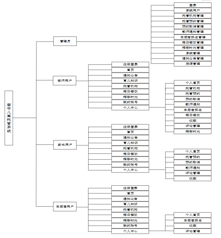 前台用户端:前台用户可以划分为老师用户、家长用户、志愿者用户等使用者,主要包括首页(通知公告、育儿知识、托管机构、每日餐饮、精彩时光)、个人中心(托管机构、托管预约、预约取消、教师通知、志愿者报名、每日餐饮、精彩时光、收藏、评论管理)等功能。