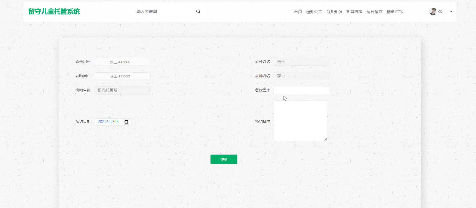 1. 简洁易用:系统设计注重简洁性与用户友好性,确保无论家长还是教师都能轻松上手。通过Springboot框架,系统可以快速部署和操作,避免繁琐的步骤,提供简洁的界面,方便家长实时查看孩子托管信息、教师发布通知、预约托管等功能。此外,系统支持多端访问,无论是PC端还是手机端,家长与教师都可以随时查看与管理相关信息。