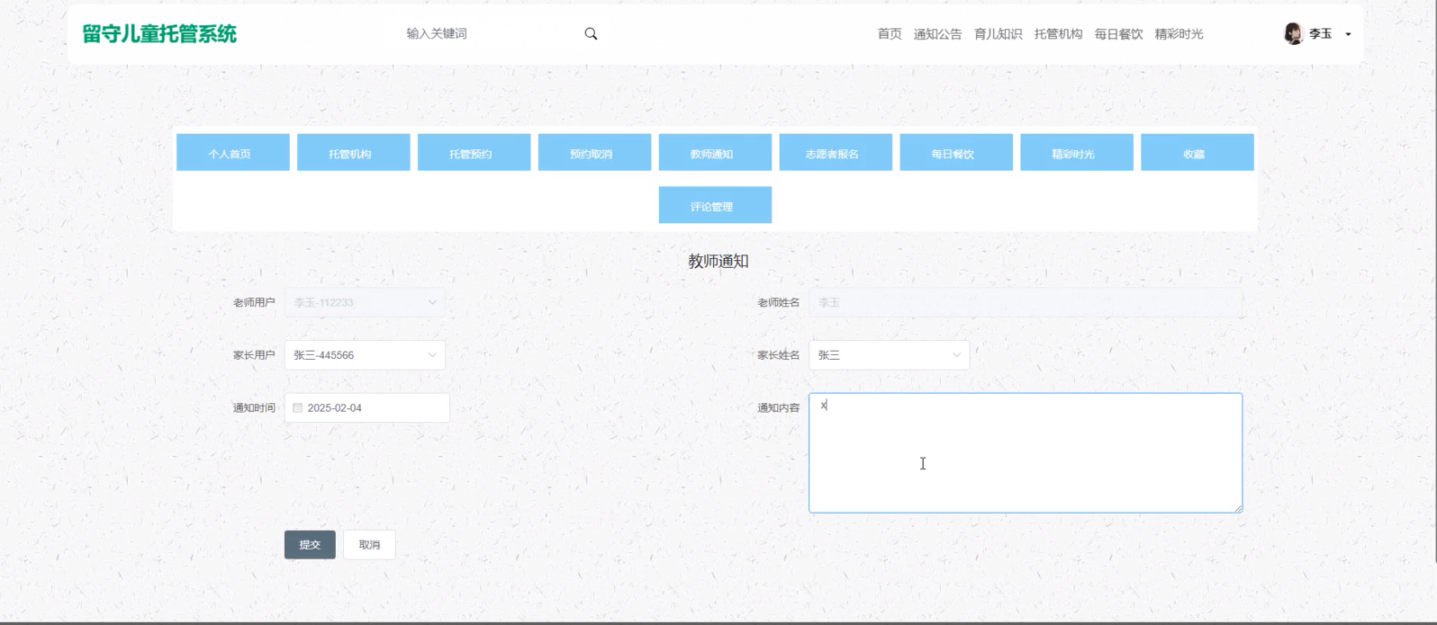 - 教师通知:老师可创建和管理通知,包括选择通知时间、指定家长用户和输入通知内容。老师可以查询、重置、删除或添加新的通知,确保及时准确地向家长传达重要信息。