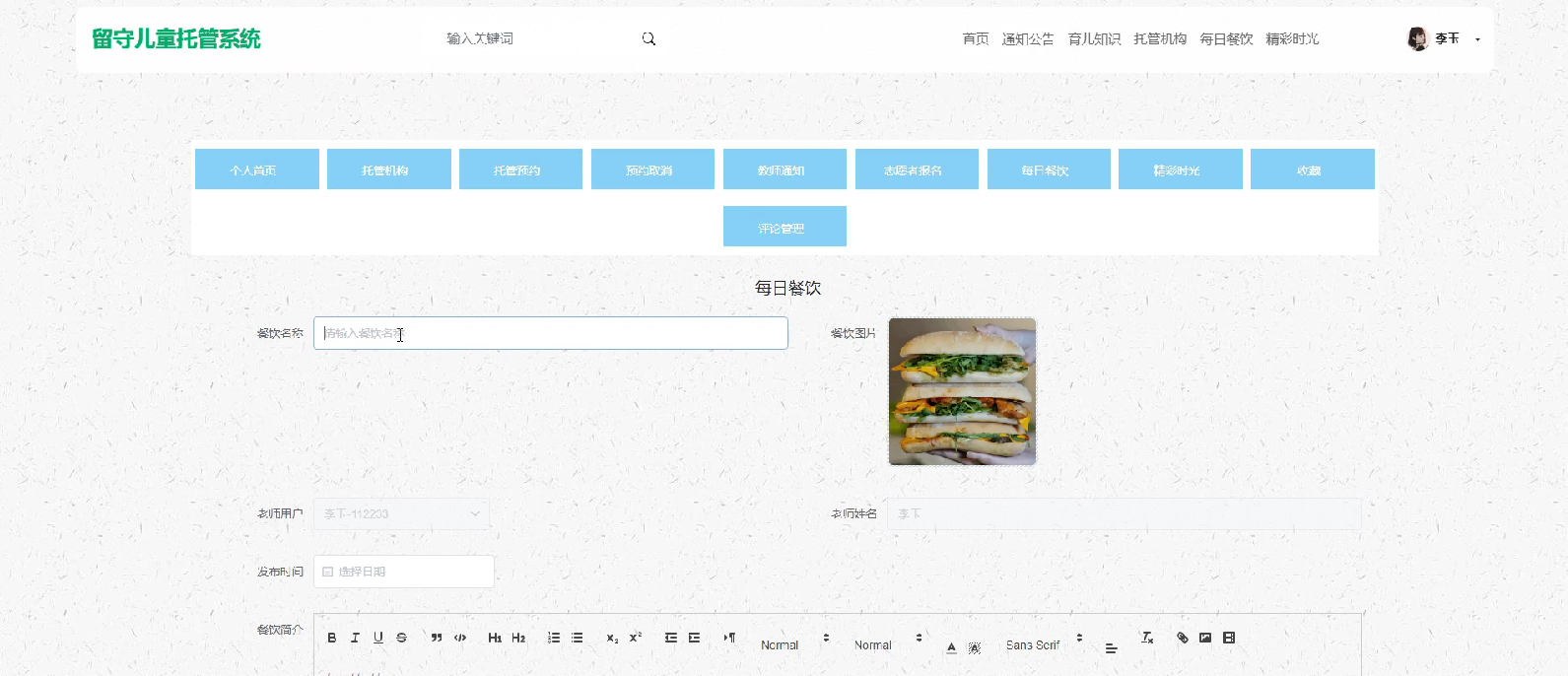 每日餐饮:每日餐饮模块提供学生每日的餐饮安排,包括餐饮的名称、图片、发布时间和简介等。老师可以查看这些信息,并进行点赞、收藏或评论,确保学生饮食健康和营养均衡。