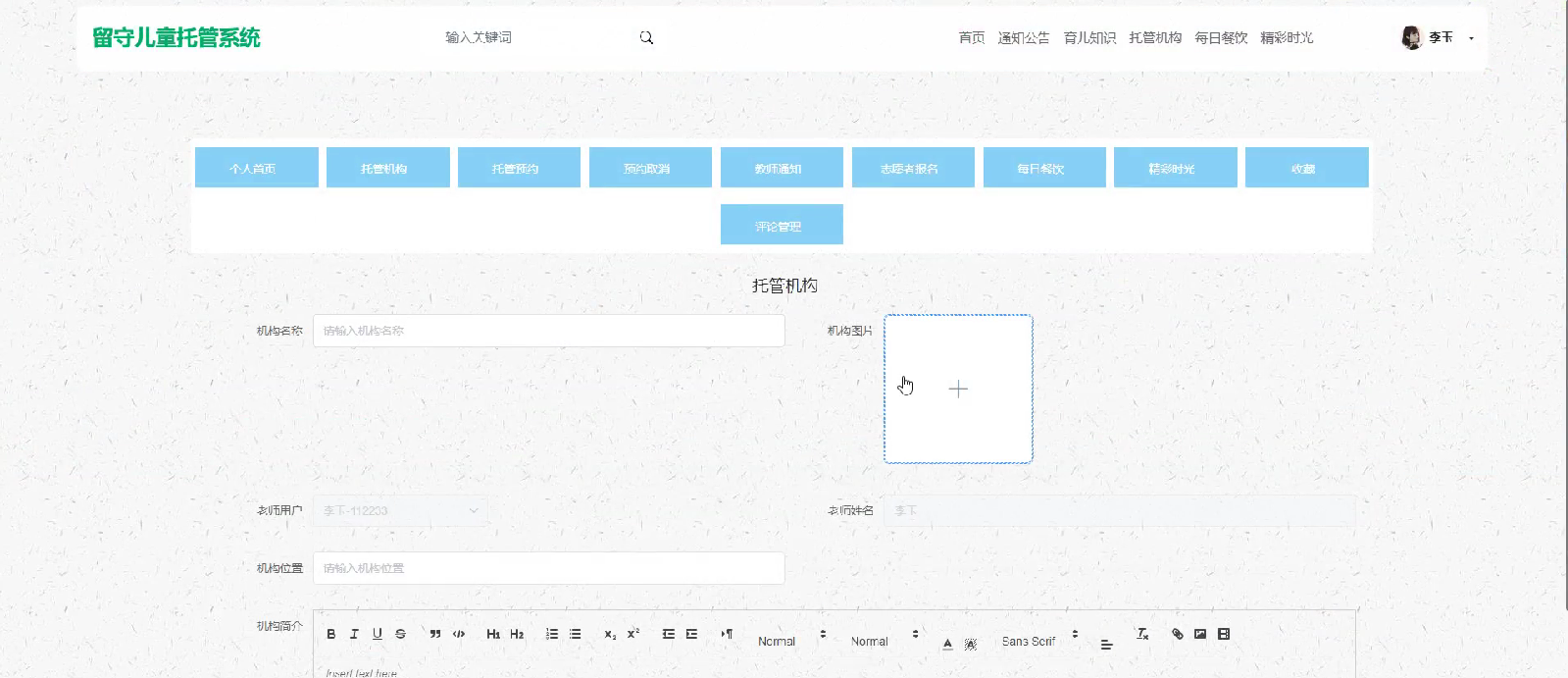 个人中心:个人中心是老师用户端的个人信息管理区域,老师可以在此查看和管理自己的托管机构、托管预约、预约取消、教师通知、志愿者报名、每日餐饮、精彩时光、收藏和评论管理等信息。个人中心还允许老师编辑自己的账户信息,如修改密码、更新联系方式等。