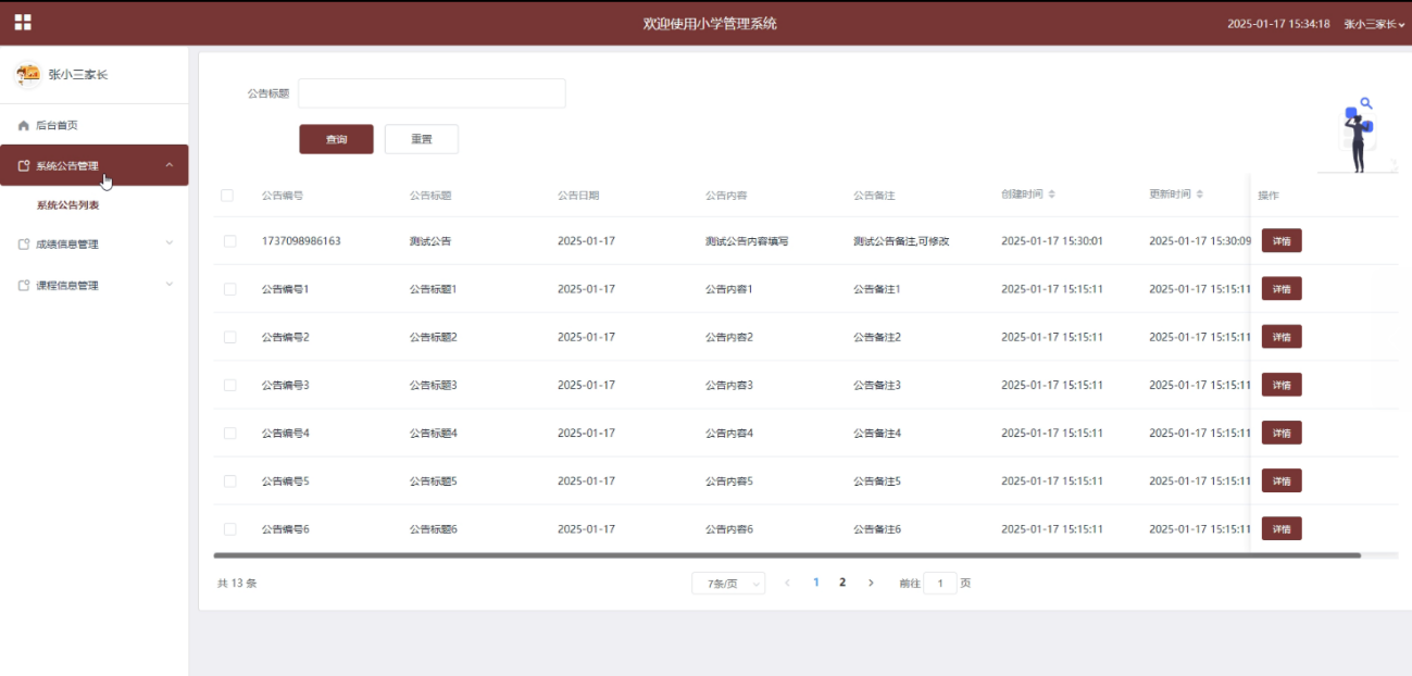 (2)系统公告管理:通过系统公告管理,家长可以及时获取学校发布的各类通知和公告,确保不会错过任何重要信息。