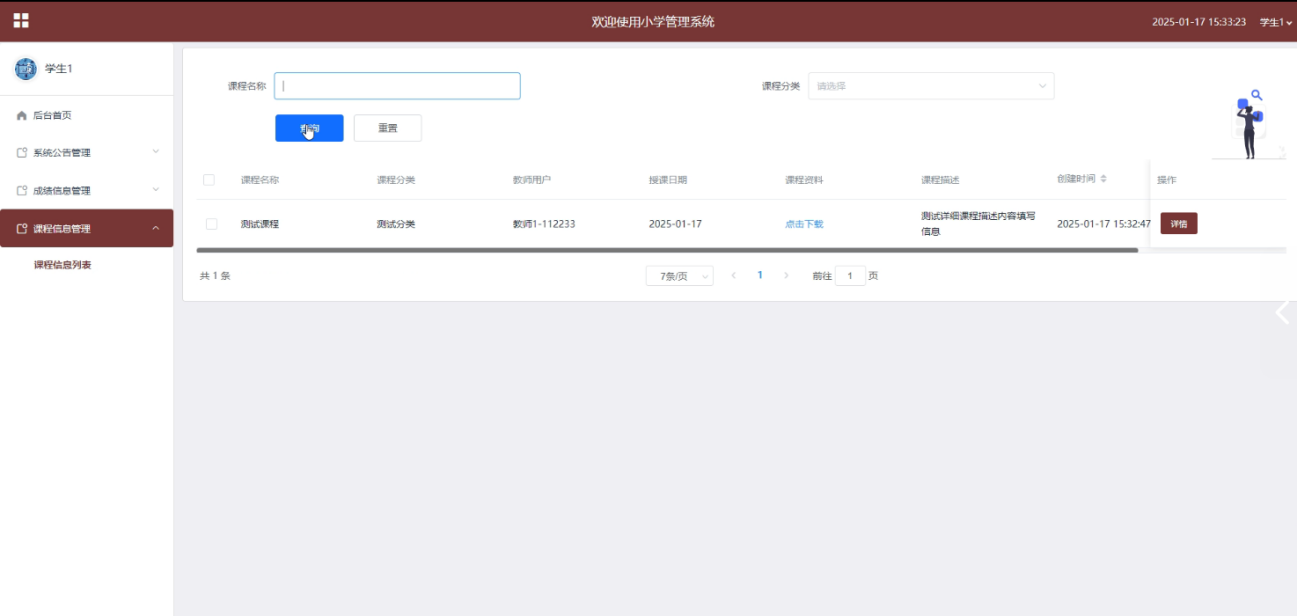 通过课程信息管理功能,学生可以全面了解自己所选课程的具体信息,如课程名称、授课教师、上课时间与地点等。该模块支持实时更新课程安排,便于学生随时掌握最新的课程变动情况。界面图如下。