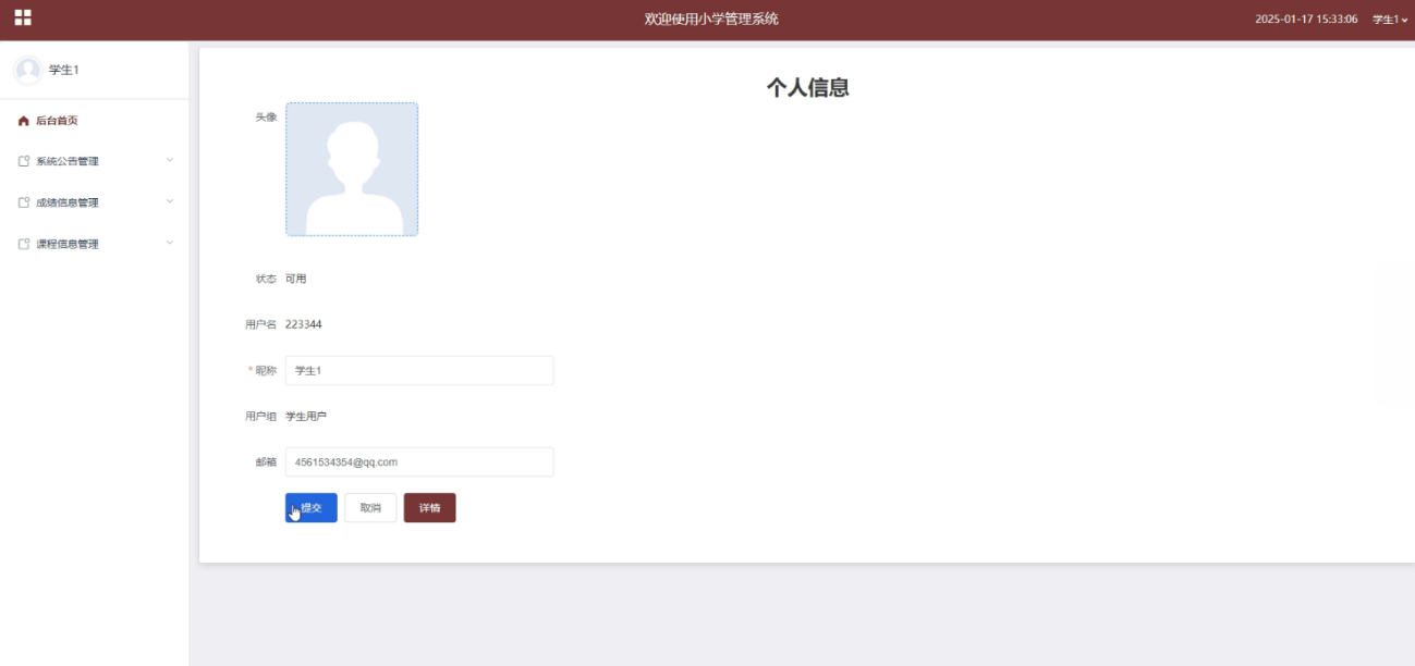 通过学生信息管理模块,教师可以方便地访问学生的详细资料,包括个人信息、出勤记录和学业进展等。这有助于教师全面了解每个学生的情况,为个别辅导和支持提供依据,并促进与家长的有效沟通。界面图如下。