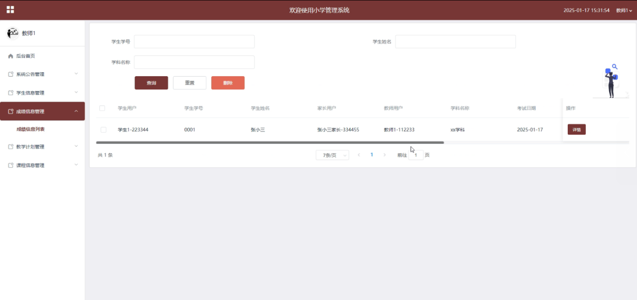 随着信息技术的快速发展,教育领域也开始广泛应用各种信息技术手段来提升教学质量和管理效率。然而,许多小学在日常管理和教学过程中仍依赖于传统的人工方式或简单电子表格进行学生信息、成绩信息和课程安排等的管理工作。这种方式不仅效率低下,容易出错,而且难以满足现代教育管理对于数据处理速度、准确性以及信息共享的需求。因此,开发一个高效、便捷且功能全面的小学管理系统显得尤为重要。通过集成注册登录、系统公告、成绩信息、课程信息等多项功能于一体,该系统能够显著减少学校管理人员的工作负担,提高信息处理速度和准确性,从而有效提升整体管理效率。系统为学生及其家长提供了一个透明的信息平台,使他们可以随时查看学生的成绩信息、课程安排等重要信息,增强了家校沟通,有助于共同促进学生的成长和发展。通过对学生成绩、课程参与情况等数据的收集与分析,系统能够为学校的教学计划调整、资源分配等决策提供有力的数据支持,帮助学校更好地规划未来发展。系统的设计考虑了课程分类管理及教学计划的功能,有利于整合和优化教育资源,实现优质教育资源的共享,推动教育公平化的发展。采用Java编程语言结合Spring Boot框架开发,并使用MySQL数据库存储数据,确保系统的稳定性和安全性,保护师生个人信息的安全。本研究通过开发一套基于Java的小学管理系统,解决当前小学教育管理中存在的问题,提高教育管理水平和教学质量,同时为未来教育信息化发展提供新的思路和解决方案。