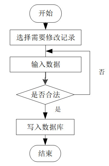 用户首先选择需要修改的记录,输入修改后的数据,系统判断输入数据是否合法。若数据不合法,提示重新输入;若数据合法,则将修改后的数据写入数据库,完成操作后流程结束。修改信息流程图如图3-10所示。