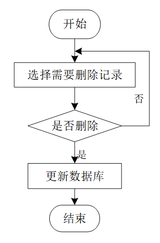 用户选择需要删除的记录后,系统判断是否确认删除。若未确认,返回选择环节;若确认删除,则更新数据库,删除对应记录,完成操作后流程结束。删除信息流程图如图3-11所示。