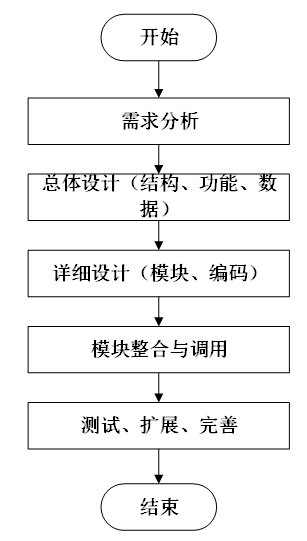 系统开发流程的主要步骤,从需求分析到系统完成的全过程。流程包括需求分析、总体设计(结构、功能、数据)、详细设计(模块、编码)、模块整合与调用,以及测试、扩展和完善,最终完成系统的开发。本系统的开发流程如图3-6所示