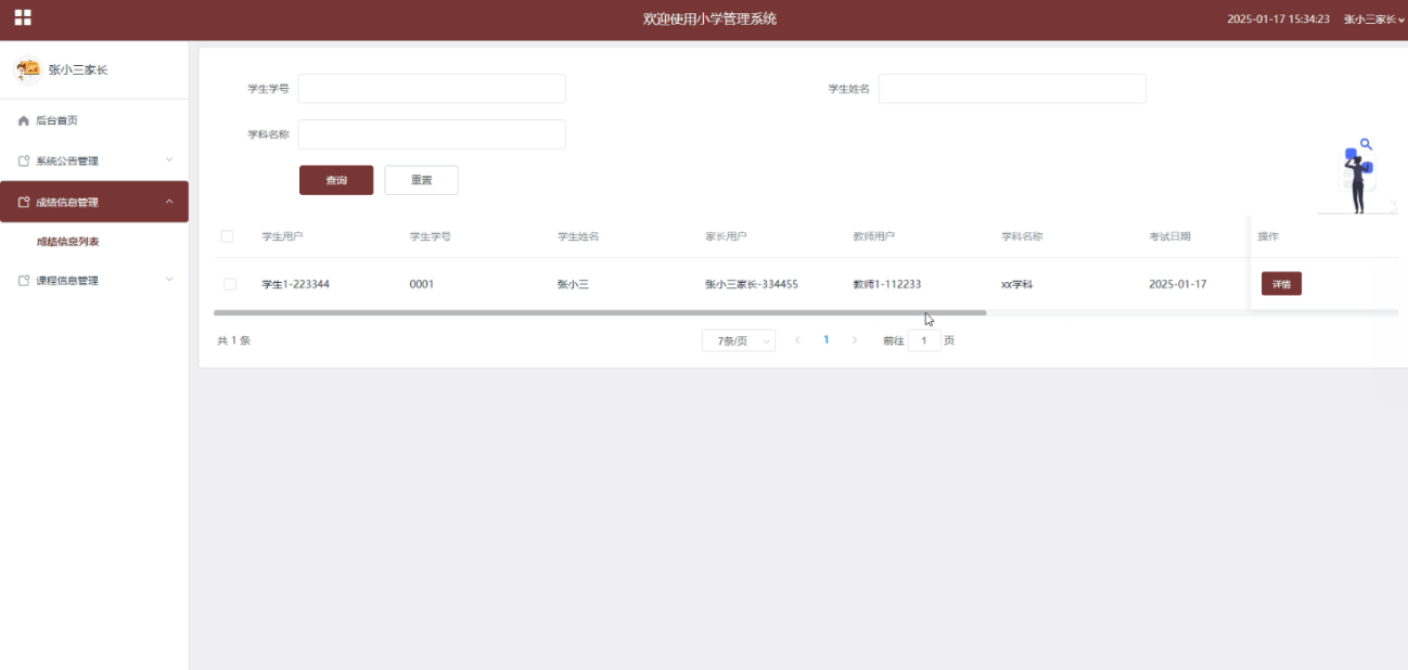 成绩信息管理功能让家长能够随时查看孩子各科目的学习成绩及教师评语,以便了解孩子的学业表现和支持其学习进步。界面图如下。