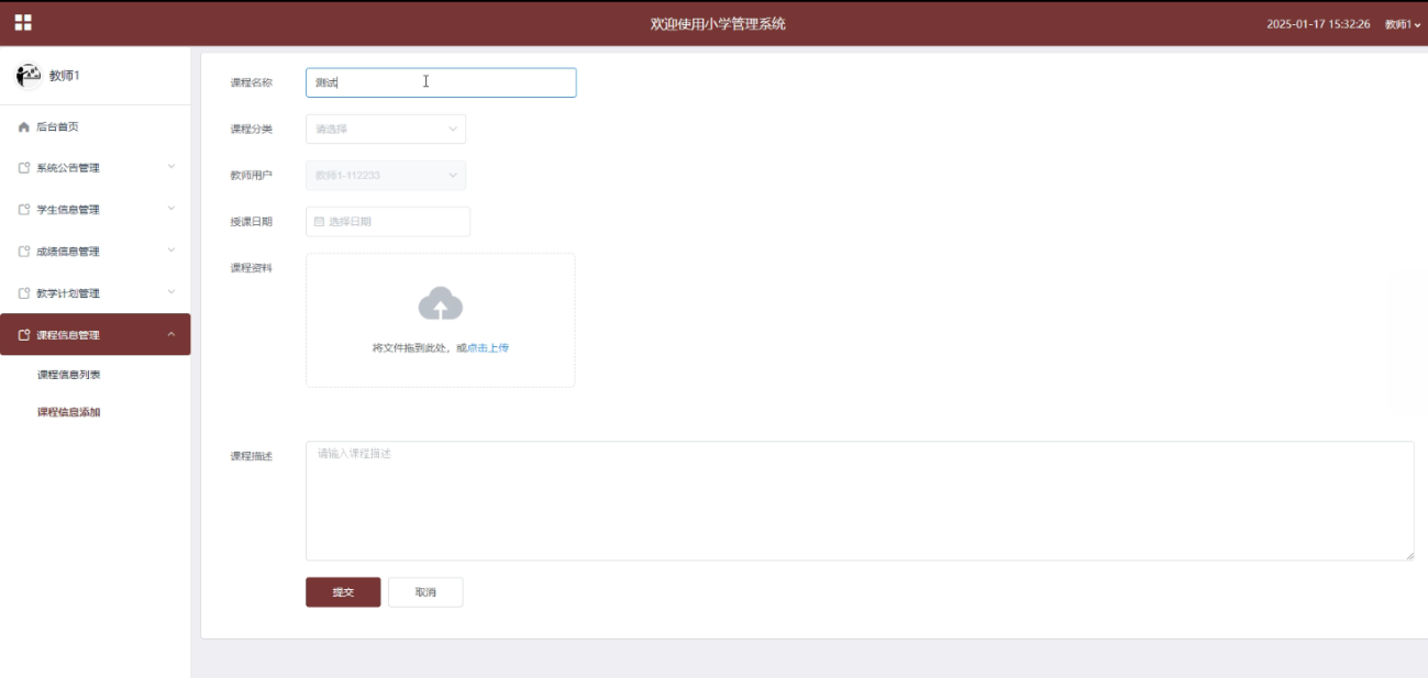 课程信息管理功能让教师能够创建、维护和更新课程相关信息,如课程描述、上课时间表和授课地点等。此外,教师还可以在此模块中上传课程材料和作业要求,便于学生随时查阅和准备,促进学习过程的顺利进行。界面图如下。