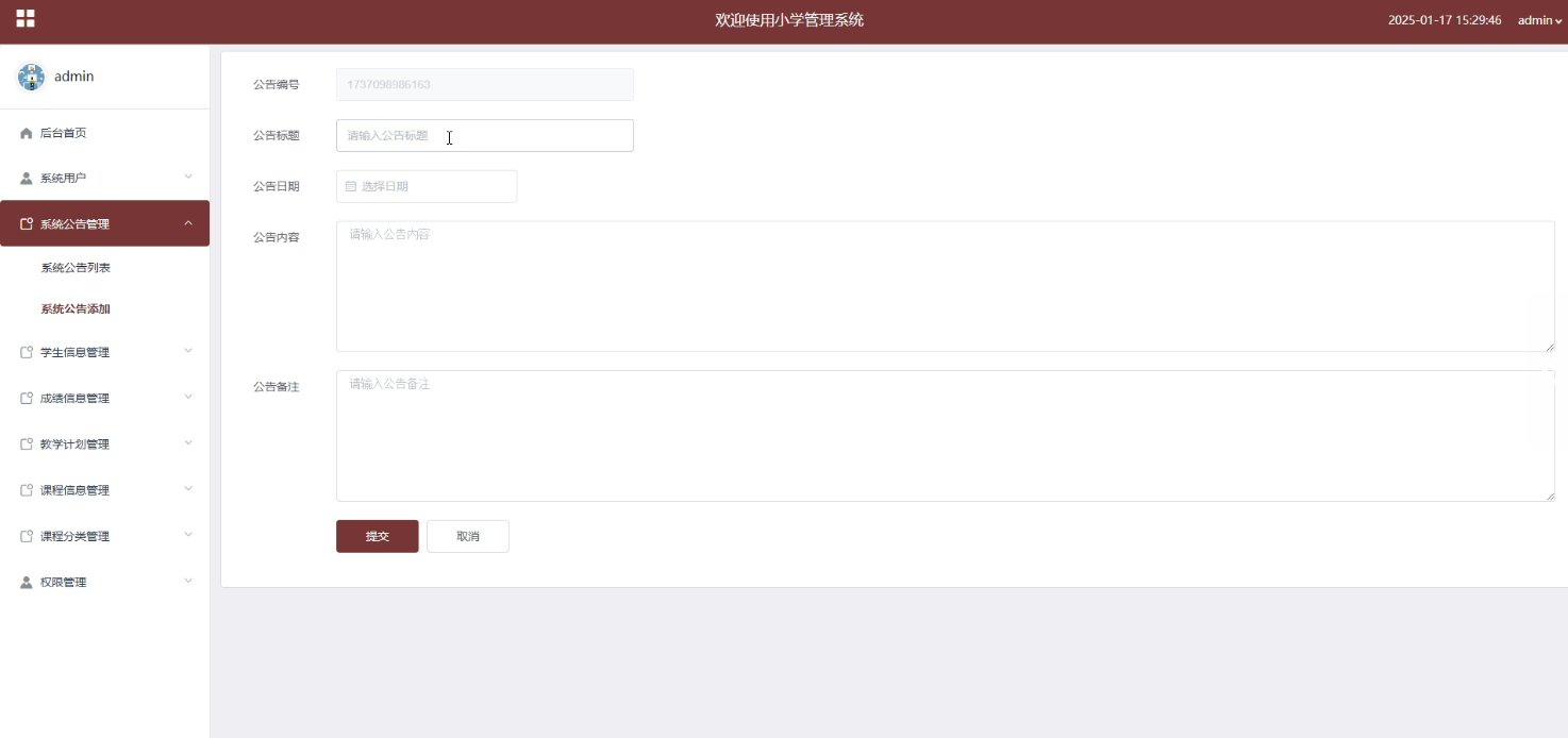 (4)系统公告管理:主要用于发布、管理和查看学校的各种通知和公告。这一模块能够帮助学校管理员高效地传达重要信息给学生、教师和家长,确保信息的及时性和准确性。