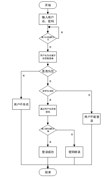 用户输入用户名和密码后,系统先检查输入是否为空,再验证用户名是否存在,若存在则通过用户名获取密码并校验。若密码正确则登录成功,否则提示密码错误。若用户名不存在或无法登录,提示用户操作无效。如图3-7所示。