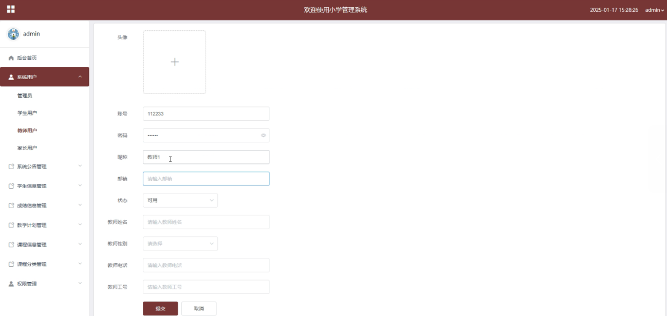 在系统用户管理模块中,管理员可以添加、删除或修改系统用户的账号信息,包括学生、家长和教师的账户,确保所有用户的信息准确无误并及时更新。界面图如下。