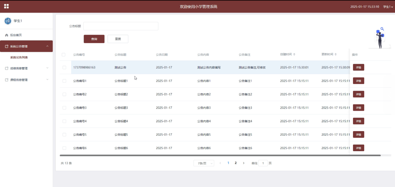 此功能模块为学生提供了一个集中查看学校发布的各类通知和公告的平台。通过系统公告管理,学生能够第一时间获取学校的最新动态、活动安排以及重要通知,确保信息传递的及时性和准确性,其主界面展示如下图所示。
