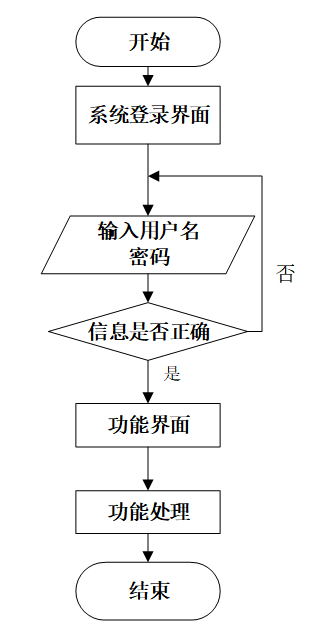 用户首先进入系统登录界面,输入用户名和密码后,系统验证信息是否正确。若验证失败,返回登录界面重新输入;若验证成功,则进入功能界面,执行相应功能处理后结束操作流程。操作流程如图3-8所示。