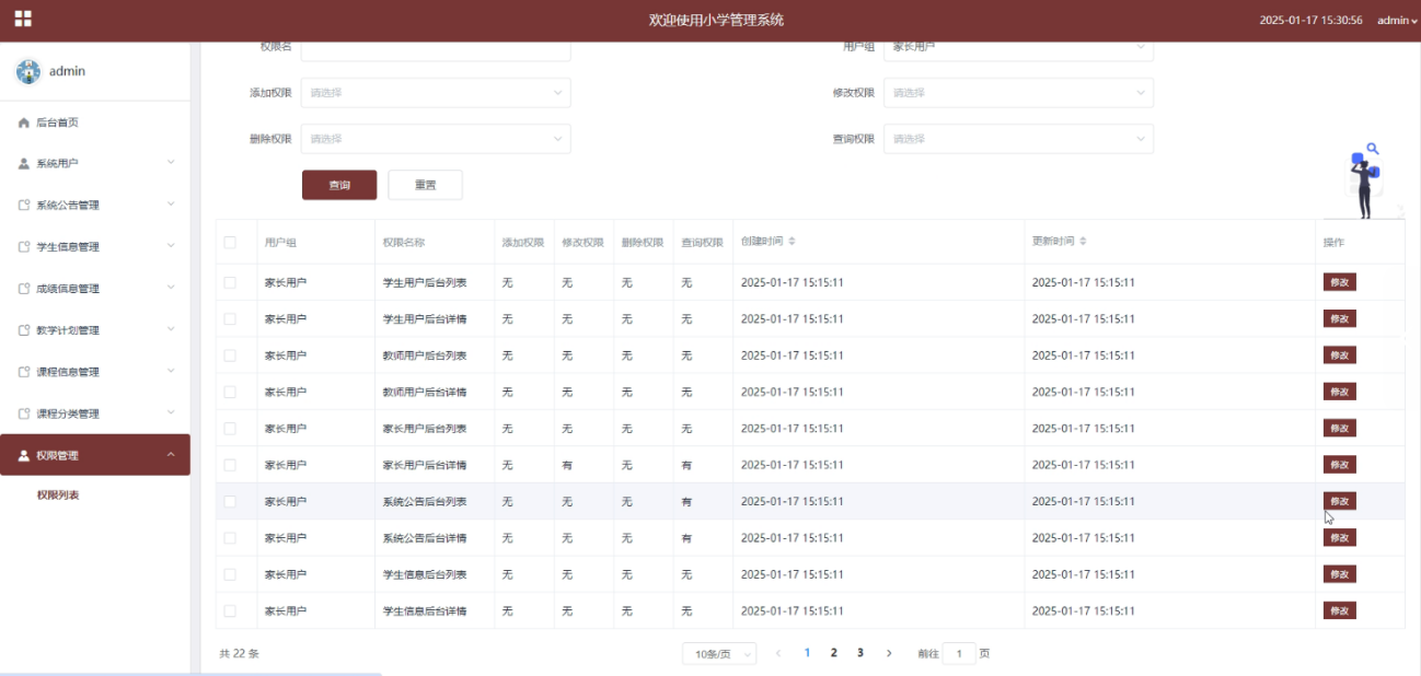 (10)权限管理:管理员点击可对系统用户权限进行查询、修改、添加和删除。