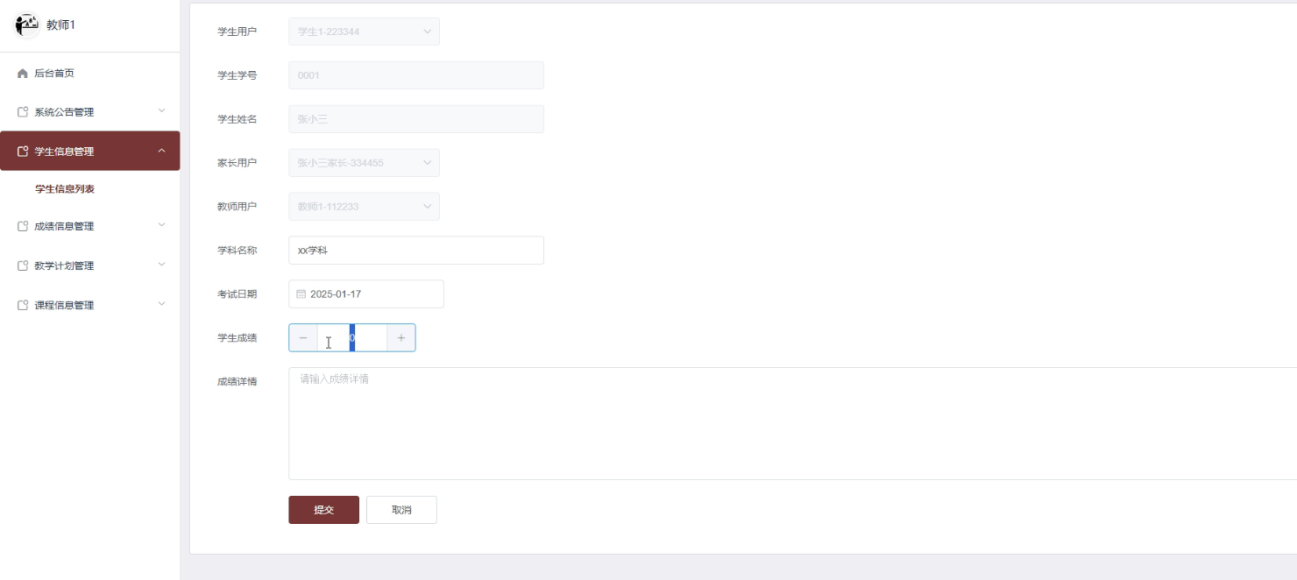 成绩信息管理功能使教师能够高效地录入、查看和分析学生的考试及平时成绩,同时支持生成成绩报告单。通过对成绩数据的深入分析,教师可以识别学生的学习难点,制定针对性的教学策略,帮助学生提升学习成绩。界面图如下。