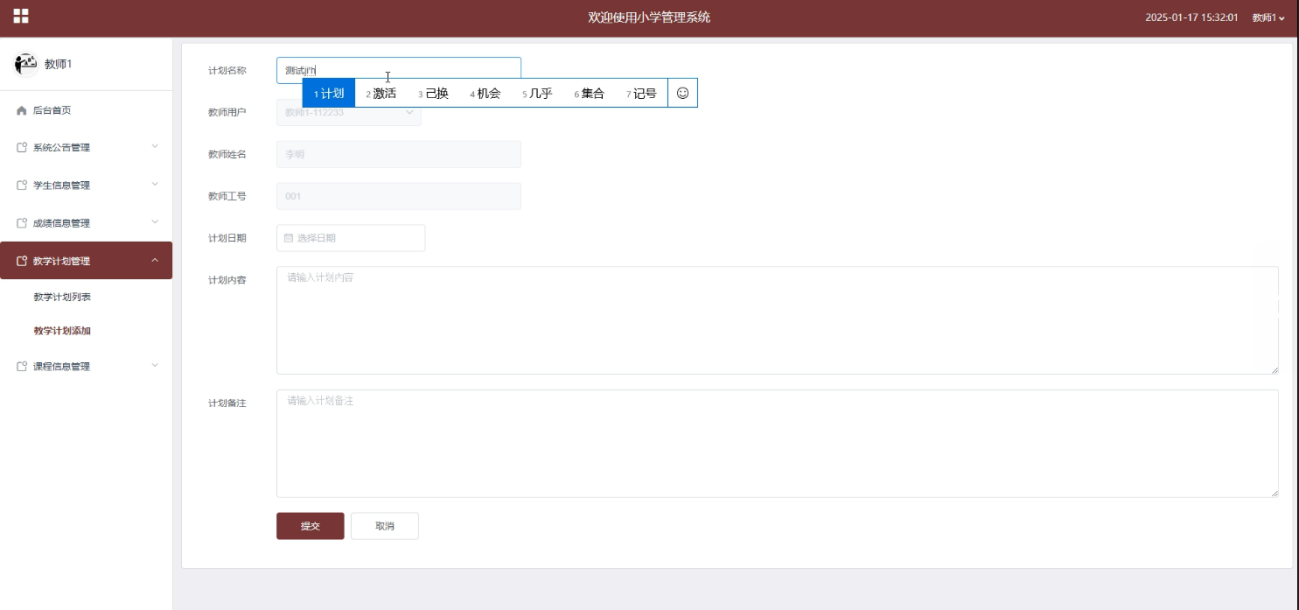 (6)教学计划管理:可以高效地制定、管理和执行教学计划。该模块通过科学的规划和系统的管理,确保教学活动有序进行,并提升教学质量。