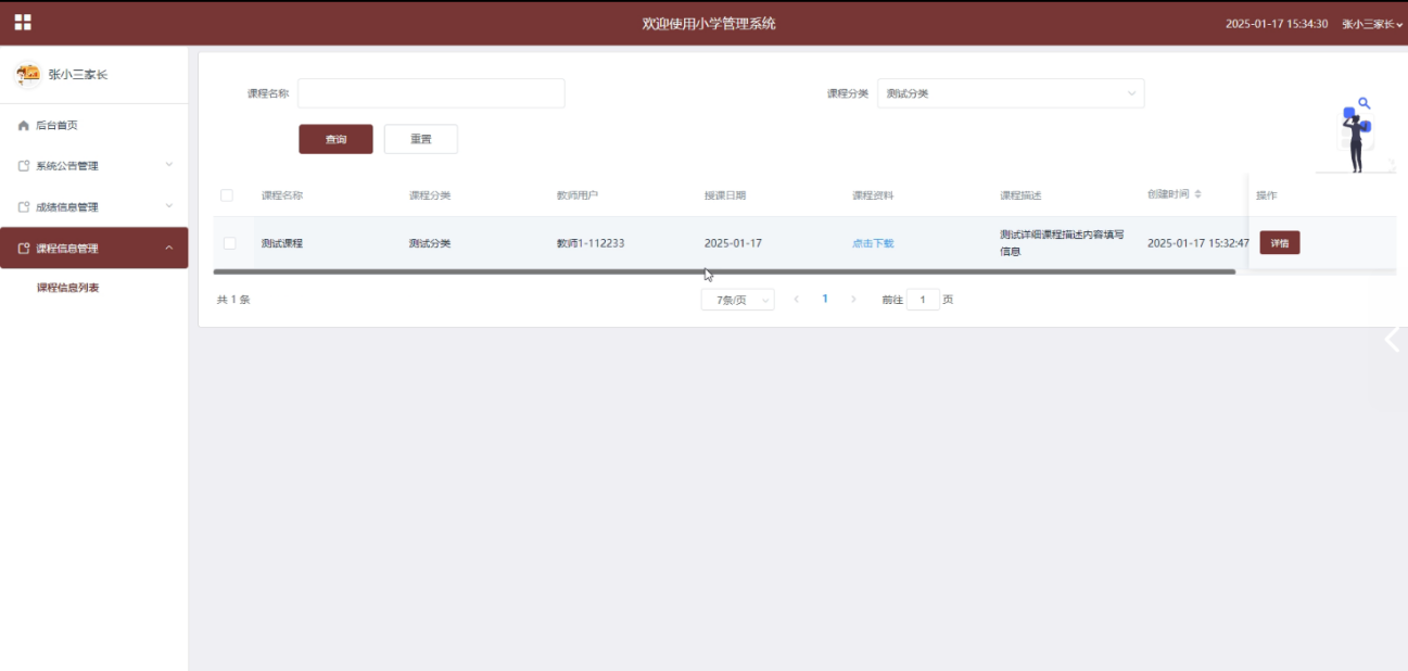 课程信息管理为家长提供了查看孩子所选课程详细信息的功能,包括上课时间、地点和授课教师等,便于家长协助孩子更好地规划学习日程。界面图如下。