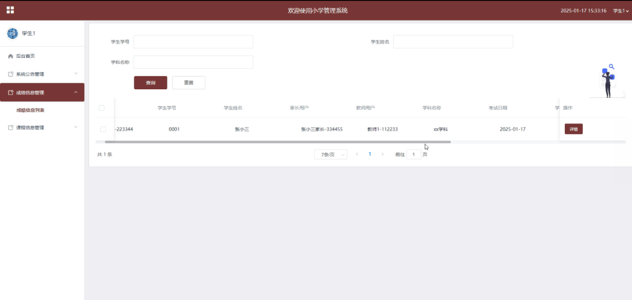 成绩信息管理模块允许学生查看自己的学习成绩详情,包括各科目的考试成绩、平时成绩及综合评价。学生不仅能了解自己在各个学科的表现,还能通过成绩趋势分析自己的学习进步情况。界面图如下。