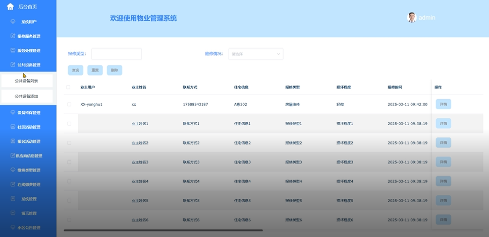 - 物业管理:系统提供详细的物业信息录入、分类和查询功能。业主用户、物业用户和管理员都可以通过后台首页查看物业信息统计。系统支持多种服务与管理功能,包括报修服务、服务处理、报名活动、在线缴费、社区互动、投诉建议等。业主用户可以发起各类申请,物业用户审核并管理这些申请,确保申请合理并进行后续操作。