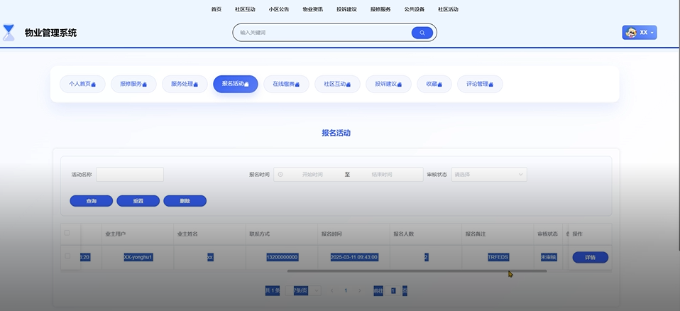 - 报名活动:简化业主对社区活动的报名流程。显示可报名的活动与详情,提交报名表单,报名状态查询和修改