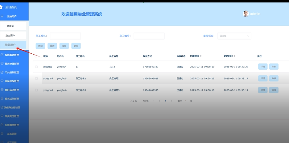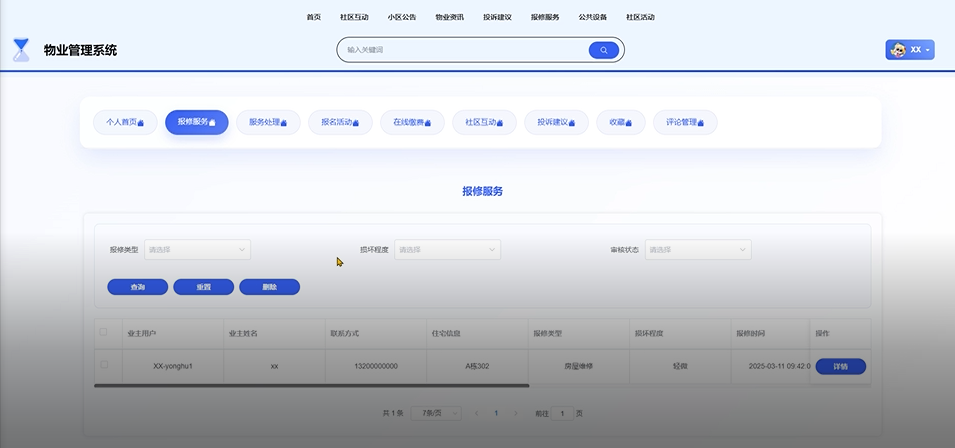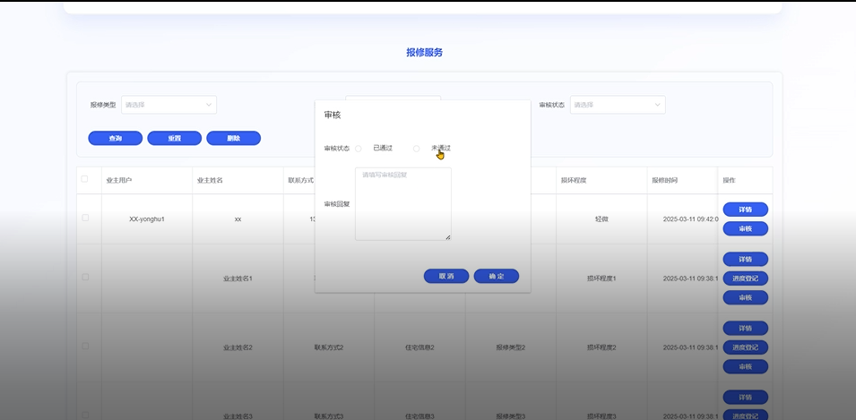 物业用户审核服务处理:所有报修请求,并进行处理和更新状态。: 提供搜索和筛选功能,方便管理员快速找到需要处理的请求,并更新处理结果。