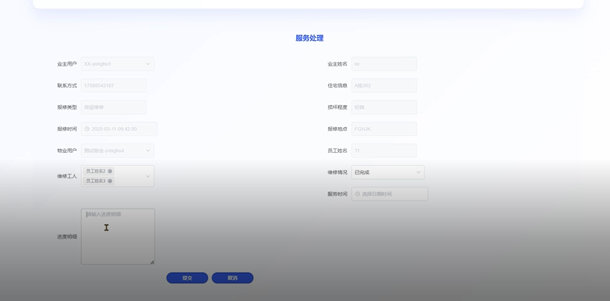 服务处理管理:查看和处理报修请求,更新处理进度,记录处理结果。 管理员可以查看所有报修请求并可以进行修改和状态更新,记录处理信息。