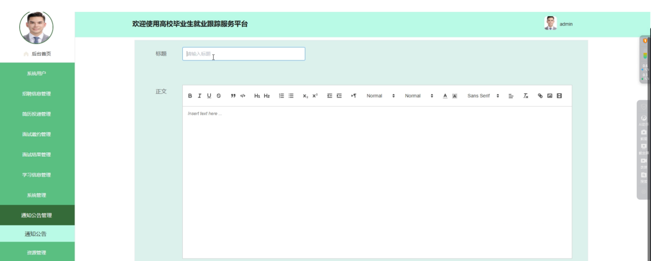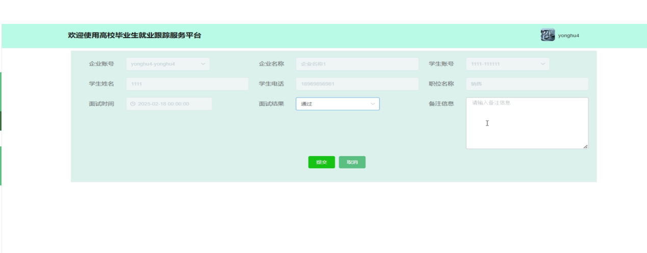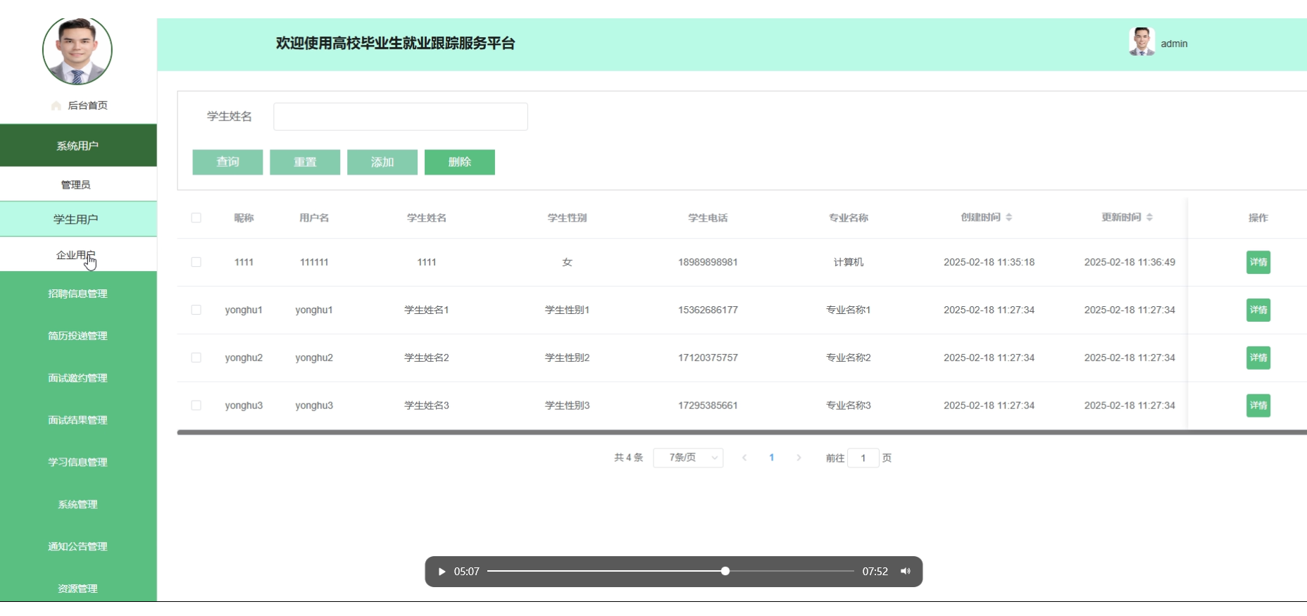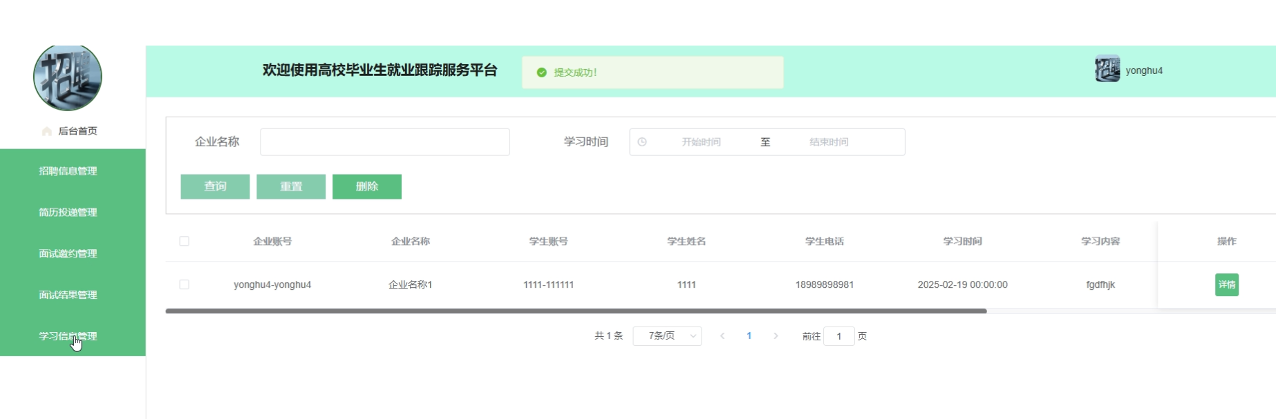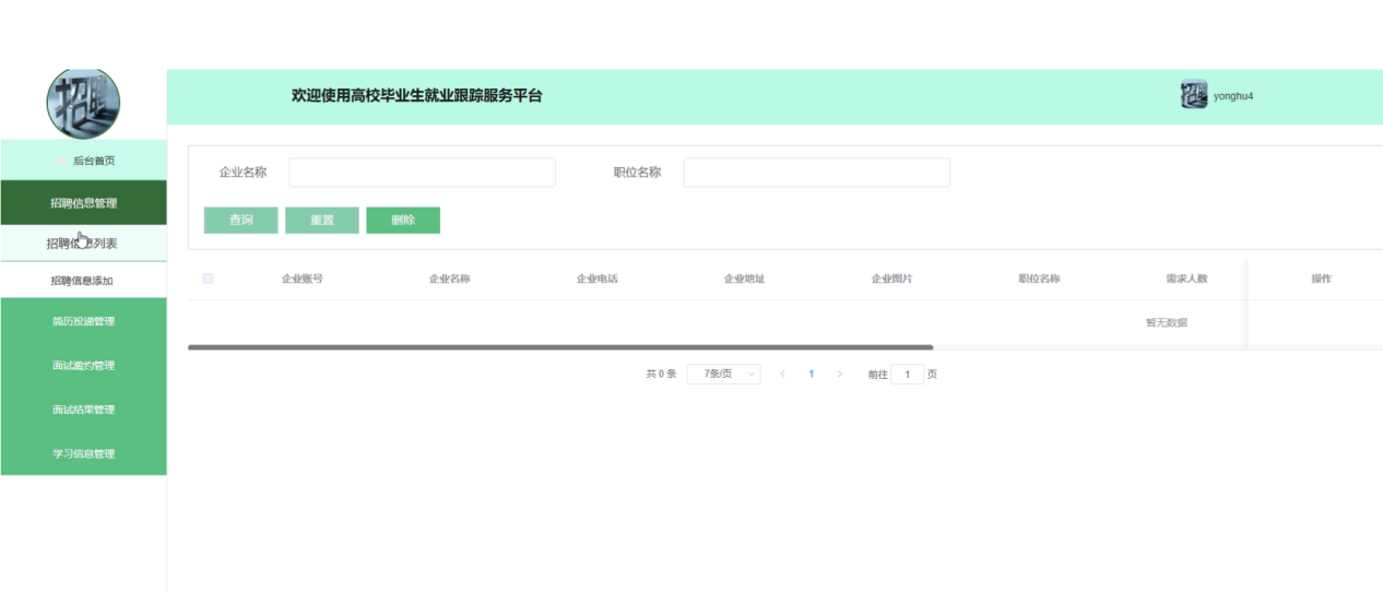 In the context of the increasingly complex employment situation, the issue of employment for college graduates has attracted much attention. The Spring Boot employment tracking service platform for college graduates has emerged, which utilizes advanced Spring Boot technology architecture to create an efficient, convenient, and fully functional comprehensive employment service platform. The platform has carefully designed three types of user roles: administrators, enterprises, and students. By providing targeted functions for different users, it comprehensively assists in tracking the employment of college graduates, builds a close communication bridge between universities, enterprises, and students, and promotes the efficient circulation and accurate matching of employment information.