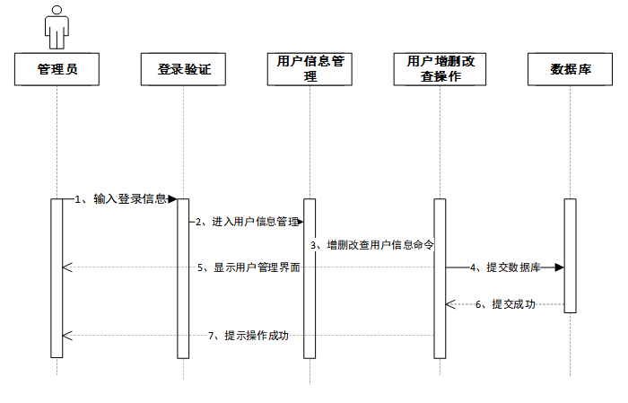 管理员输入登录信息后,进入用户信息管理模块,选择增删改查操作并提交命令至数据库。数据库执行操作后返回成功状态,系统显示用户管理界面并提示操作成功。管理员修改用户信息时序图如图4-5所示。